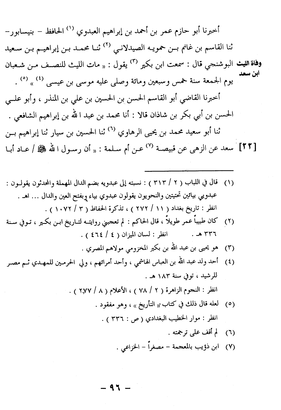 أَخْبَرَنَا أَبُو حَازِمٍ عُمَرُ بْنُ أَحْمَدَ بْنِ إبراهيم العبدوي1 الحافظ – بنيسابوري – ثنا الْقَاسِمُ بْنُ غَانِمِ بْنِ حَمُّوَيْهِ الصَّيْدَلانِيُّ2 ثنا مُحَمَّدُ بْنُ إِبْرَاهِيمَ بْنِ سَعِيدٍ الْبُوشَنْجِيُّ قَالَ: سَمِعْتُ ابْنَ بُكَيْرٍ3 يَقُولُ: "مَاتَ اللَّيْثُ لِلنِّصْفِ مِنْ شَعْبَانَ يَوْمَ الْجُمُعَةِ سَنَةَ خَمْسٍ وَسَبْعِينَ وَمِائَةٍ وَصَلَّى عَلَيْهِ مُوسَى بْنُ عِيسَى4"5.