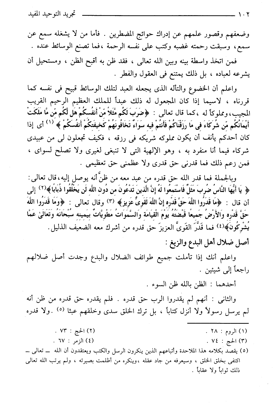 واعلم أن الخضوع والتأله الذى يجعله العبد لتلك الوسائط قبيح في نفسه كما قررناه، لا سيما إذا كان المجعول له ذلك عبدا للملك العظيم الرحيم القريب المجيب، ومملوكا له، كما قال تعالى: ضَرَبَ لَكُمْ مَثَلًا مِنْ أَنْفُسِكُمْ هَلْ لَكُمْ مِنْ ما مَلَكَتْ أَيْمانُكُمْ مِنْ شُرَكاءَ فِي ما رَزَقْناكُمْ فَأَنْتُمْ فِيهِ سَواءٌ تَخافُونَهُمْ كَخِيفَتِكُمْ أَنْفُسَكُمْ