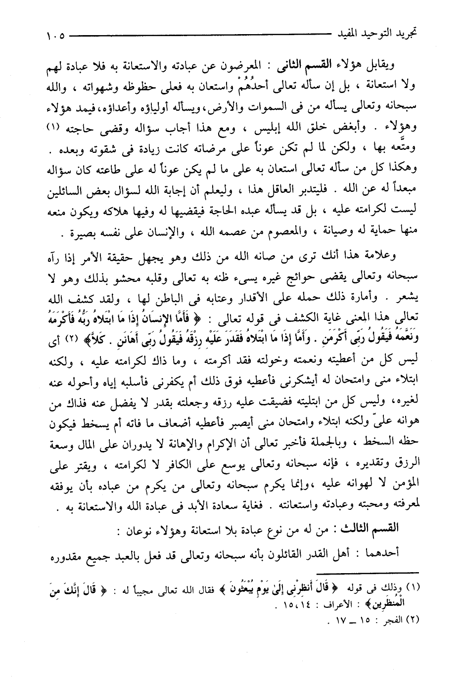ويقابل هؤلاء القسم الثانى: المعرضون عن عبادته والاستعانة به فلا عبادة لهم ولا استعانة، بل إن سأله تعالى أحدهم واستعان به فعلى حظوظه وشهواته، والله سبحانه وتعالى يسأله من في السموات والأرض، ويسأله أولياؤه وأعداؤه، فيمد هؤلاء وهؤلاء. وأبغض خلق الله إبليس، ومع هذا أجاب سؤاله وقضى حاجته «1» ومتّعه بها، ولكن لما لم تكن عونا على مرضاته كانت زيادة في شقوته وبعده.