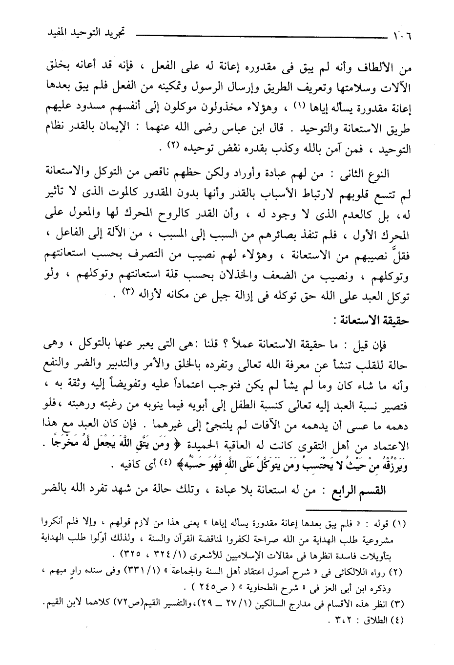 النوع الثانى: من لهم عبادة وأوراد ولكن حظهم ناقص من التوكل والاستعانة لم تتسع قلوبهم لارتباط الأسباب بالقدر وأنها بدون المقدور كالموت الذى لا تأثير له، بل كالعدم الذى لا وجود له، وأن القدر كالروح المحرك لها والمعول على المحرك الأول، فلم تنفذ بصائرهم من السبب إلى المسبب، من الآلة إلى الفاعل، فقلّ نصيبهم من الاستعانة، وهؤلاء لهم نصيب من التصرف بحسب استعانتهم وتوكلهم، ونصيب من الضعف والخذلان بحسب قلة استعانتهم وتوكلهم، ولو توكل العبد على الله حق توكله في إزالة جبل عن مكانه لأزاله «3» .