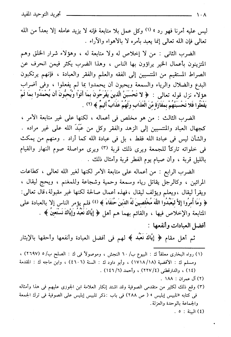 «4» فلم يؤمر الناس إلا بالعبادة على المتابعة والإخلاص فيها، والقائم بهما هم أهل إِيَّاكَ نَعْبُدُ وَإِيَّاكَ نَسْتَعِينُ.