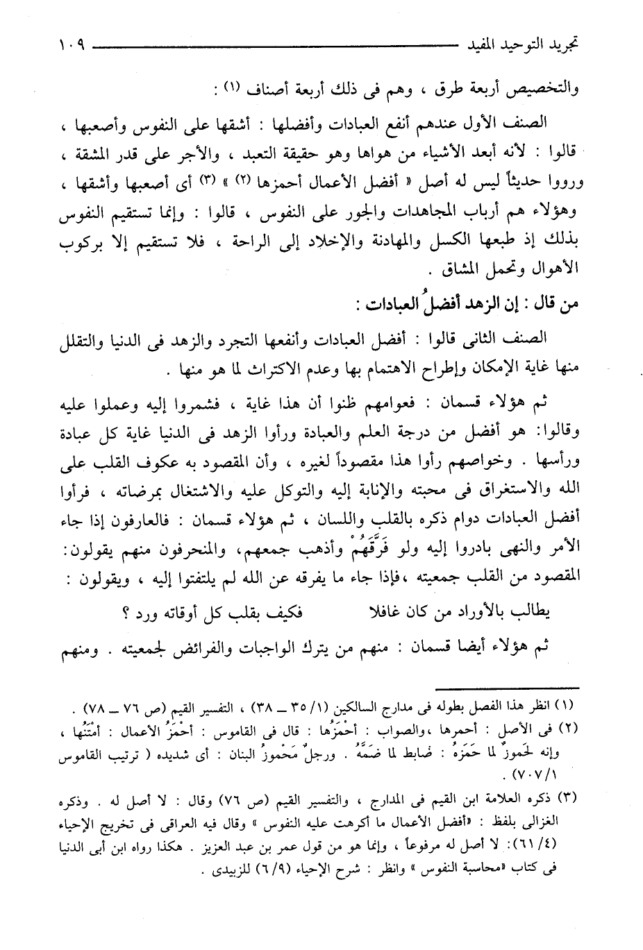 الصنف الثانى قالوا: أفضل العبادات وأنفعها التجرد والزهد في الدنيا والتقلل منها غاية الإمكان وإطراح الاهتمام بها وعدم الاكتراث لما هو منها.