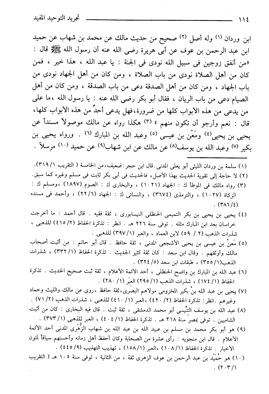 «من أنفق زوجين في سبيل الله نودى في الجنة: يا عبد الله، هذا خير، فمن كان من أهل الصلاة نودى من باب الصلاة، ومن كان من أهل الجهاد نودى من باب الجهاد، ومن كان من أهل الصدقة دعى من باب الصدقة، ومن كان من أهل الصيام دعى من باب الريان، فقال أبو بكر رضى الله عنه: يا رسول الله، ما على من يدعى من هذه الأبواب كلها من ضرورة، فهل يدعى أحد من هذه الأبواب كلها، قال: نعم وأرجو أن تكون منهم» «3» هكذا رواه عن مالك موصولا مسندا عن يحيى بن يحيى «4» ومعن بن عيسى «5» وعبد الله بن المبارك «6» . ورواه يحيى بن بكير «7» وعبد الله بن يوسف «8» عن مالك عن ابن شهاب «9» عن حميد «10» مرسلا.