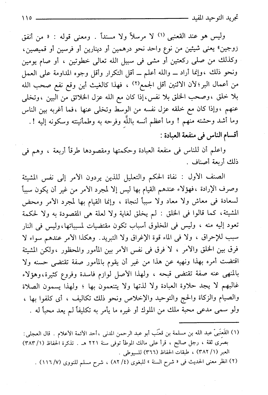 الصنف الأول: نفاة الحكم والتعليل للذين يردون الأمر إلى نفس المشيئة وصرف الإرادة، فهؤلاء عندهم القيام بها ليس إلا لمجرد الأمر من غير أن يكون سببا لسعادة في معاش ولا معاد ولا سببا لنجاة، وإنما القيام بها لمجرد الأمر ومحض المشيئة، كما قالوا في الخلق: لم يخلق لغاية ولا لعلة هى المقصودة به ولا لحكمة تعود إليه منه، وليس في المخلوق أسباب تكون مقتضيات لمسبباتها، وليس في النار سبب للإحراق، ولا في الماء قوة الإغراق ولا التبريد. وهكذا الأمر عندهم سواء لا فرق بين الخلق والأمر، لا فرق في نفس الأمر بين المأمور والمحظور، ولكن المشيئة اقتضت أمره بهذا ونهيه عن هذا من غير أن يقوم بالمأمور صفة تقتضى حسنه ولا بالمنهى عنه صفة تقتضى قبحه، ولهذا الأصل لوازم فاسدة وفروع كثيرة، وهؤلاء غالبهم لا يجد حلاوة العبادة ولا لذتها ولا يتنعمون بها؛ ولهذا يسمون الصلاة والصيام والزكاة والحج والتوحيد والإخلاص ونحو ذلك تكاليف، أى كلفوا بها، ولو سمى مدعى محبة ملك من الملوك أو غيره ما يأمر به تكليفا لم يعد محبا له.