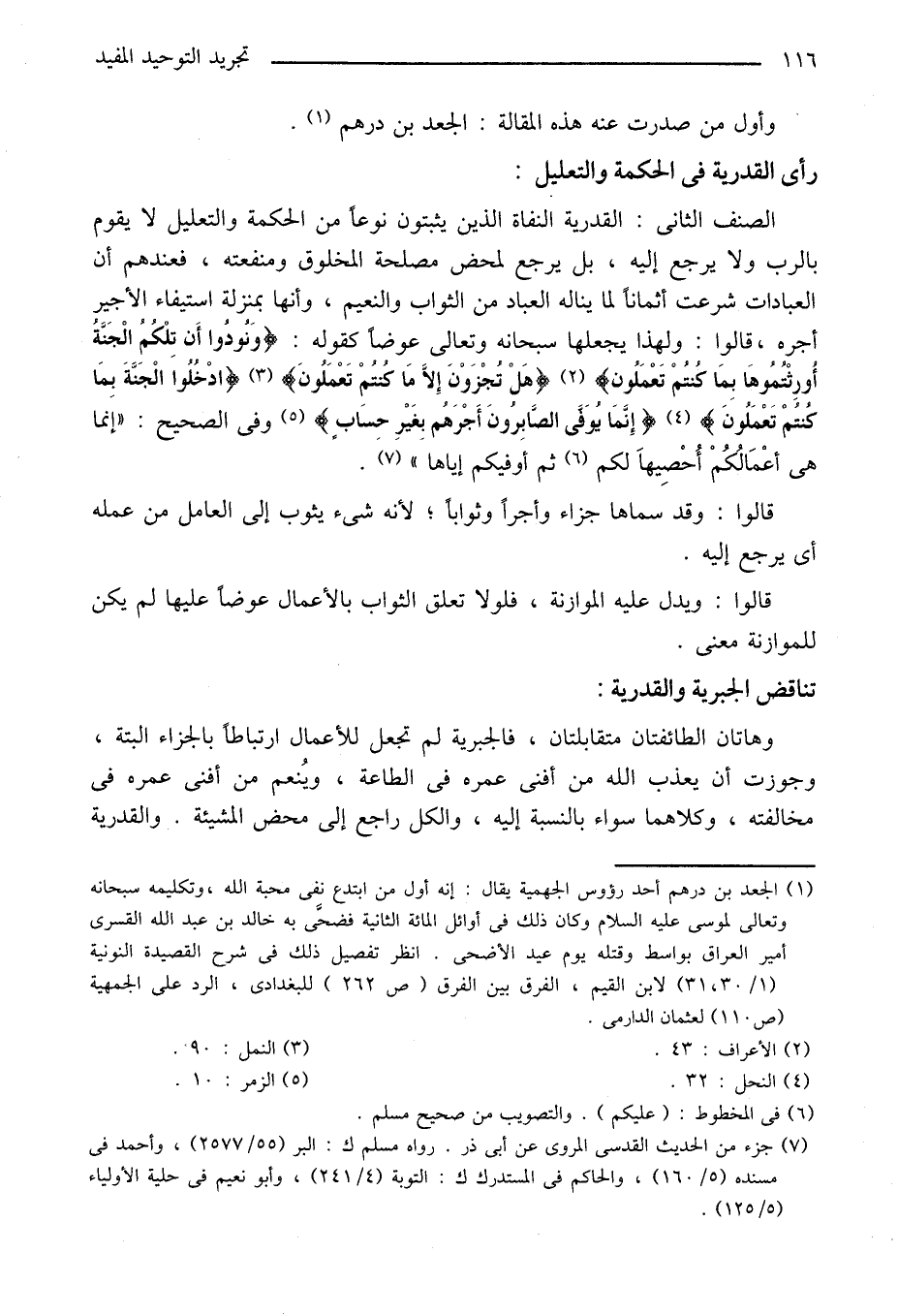 الصنف الثانى: القدرية النفاة الذين يثبتون نوعا من الحكمة والتعليل لا يقوم بالرب ولا يرجع إليه، بل يرجع لمحض مصلحة المخلوق ومنفعته، فعندهم أن العبادات شرعت أثمانا لما يناله العباد من الثواب والنعيم، وأنها بمنزلة استيفاء الأجير أجره، قالوا: ولهذا يجعلها سبحانه وتعالى عوضا كقوله: وَنُودُوا أَنْ تِلْكُمُ الْجَنَّةُ أُورِثْتُمُوها بِما كُنْتُمْ تَعْمَلُونَ