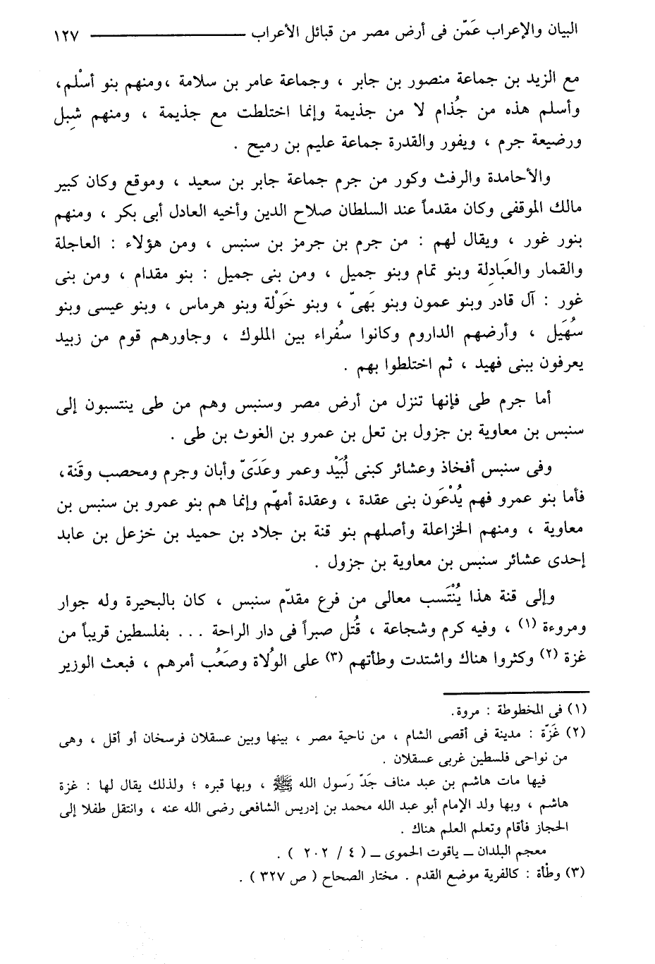 وإلى قنة هذا ينتسب معالى من فرع مقدّم سنبس، كان بالبحيرة وله جوار ومروءة «1» ، وفيه كرم وشجاعة، قتل صبرا في دار الراحة ... بفلسطين قريبا من غزة «2» وكثروا هناك واشتدت وطأتهم «3» على الولاة وصعب أمرهم، فبعث الوزير