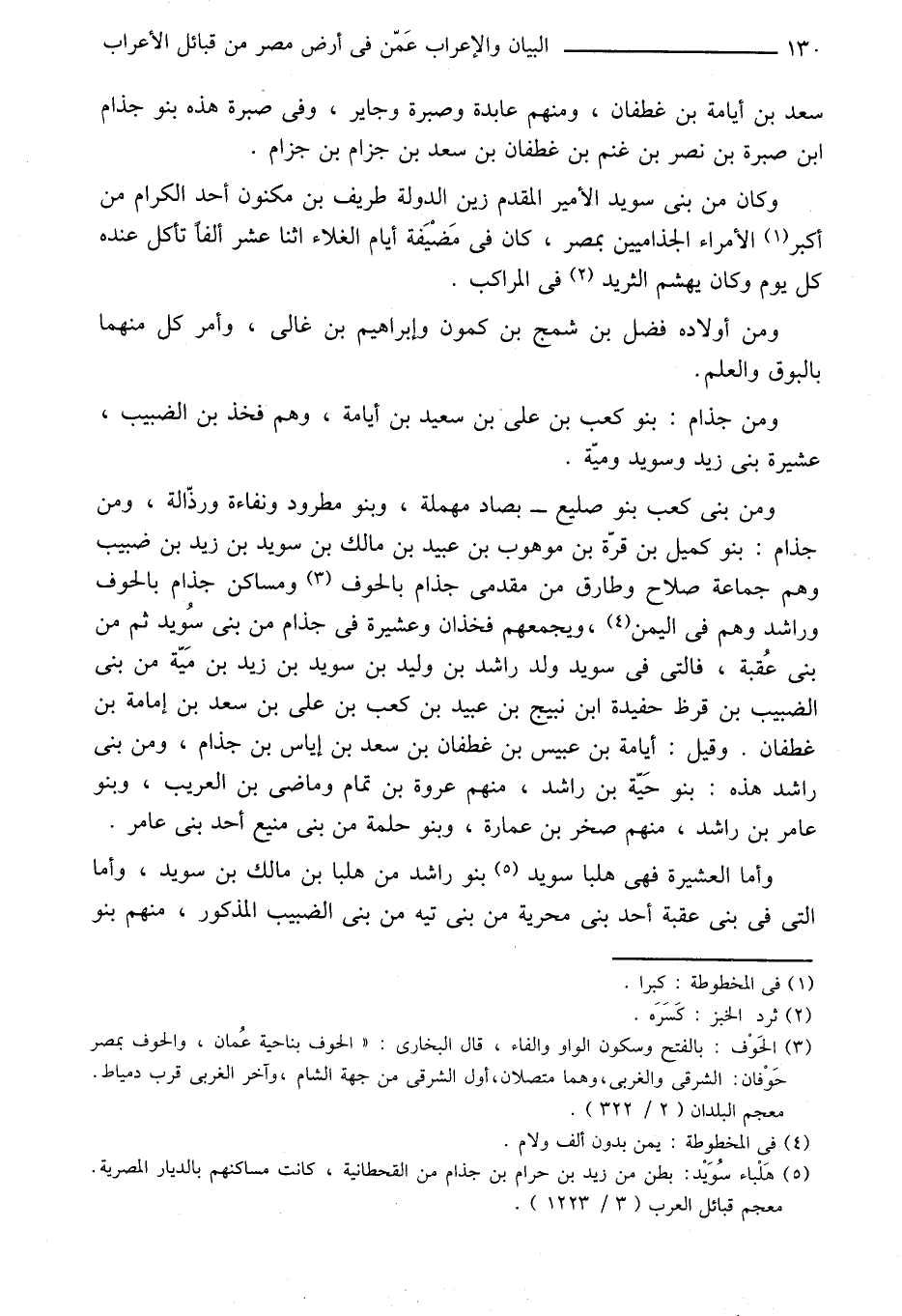 ومن بنى كعب بنو صليع- بصاد مهملة، وبنو مطرود ونفاءة ورذّالة، ومن جذام: بنو كميل بن قرّة بن موهوب بن عبيد بن مالك بن سويد بن زيد بن ضبيب وهم جماعة صلاح وطارق من مقدمى جذام بالحوف «3» ومساكن جذام بالحوف وراشد وهم في اليمن «4» ، ويجمعهم فخذان وعشيرة في جذام من بنى سويد ثم من بنى عقبة، فالتى في سويد ولد راشد بن وليد بن سويد بن زيد بن ميّة من بنى الضبيب بن قرظ حفيدة ابن نبيج بن عبيد بن كعب بن على بن سعد بن إمامة بن غطفان. وقيل: أيامة بن عبيس بن غطفان بن سعد بن إياس بن جذام، ومن بنى راشد هذه: بنو حيّة بن راشد، منهم عروة بن تمام وماضى بن العريب، وبنو عامر بن راشد، منهم صخر بن عمارة، وبنو حلمة من بنى منيع أحد بنى عامر.