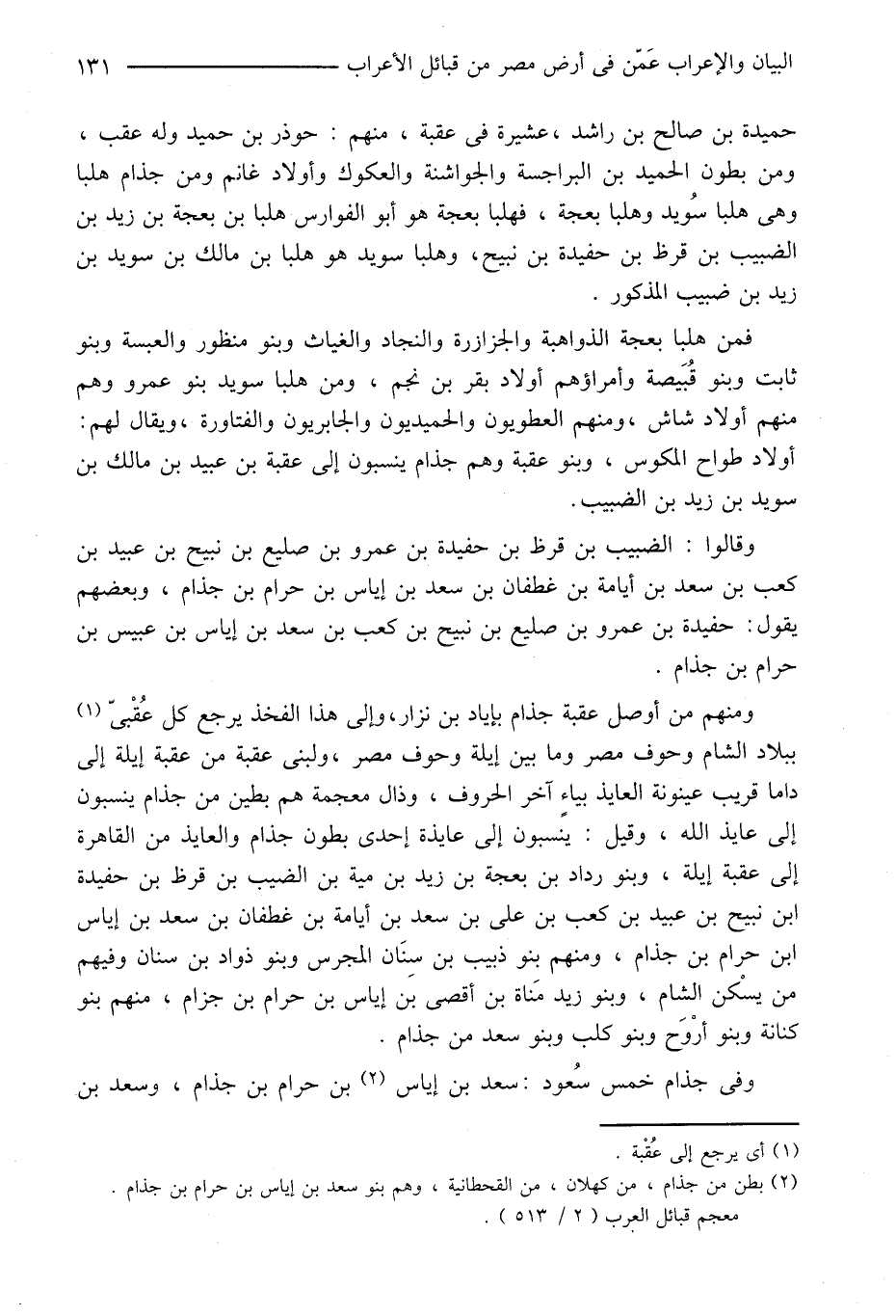 ومنهم من أوصل عقبة جذام بإياد بن نزار، وإلى هذا الفخذ يرجع كل عقبىّ «1» ببلاد الشام وحوف مصر وما بين إيلة وحوف مصر، ولبنى عقبة من عقبة إيلة إلى داما قريب عينونة العايذ بياء آخر الحروف، وذال معجمة هم بطين من جذام ينسبون إلى عايذ الله، وقيل: ينسبون إلى عايذة إحدى بطون جذام والعايذ من القاهرة إلى عقبة إيلة، وبنو رداد بن بعجة بن زيد بن مية بن الضيب بن قرظ بن حفيدة ابن نبيح بن عبيد بن كعب بن على بن سعد بن أيامة بن غطفان بن سعد بن إياس ابن حرام بن جذام، ومنهم بنو ذبيب بن سنان المجرس وبنو ذواد بن سنان وفيهم من يسكن الشام، وبنو زيد مناة بن أقصى بن إياس بن حرام بن جزام، منهم بنو كنانة وبنو أروح وبنو كلب وبنو سعد من جذام.