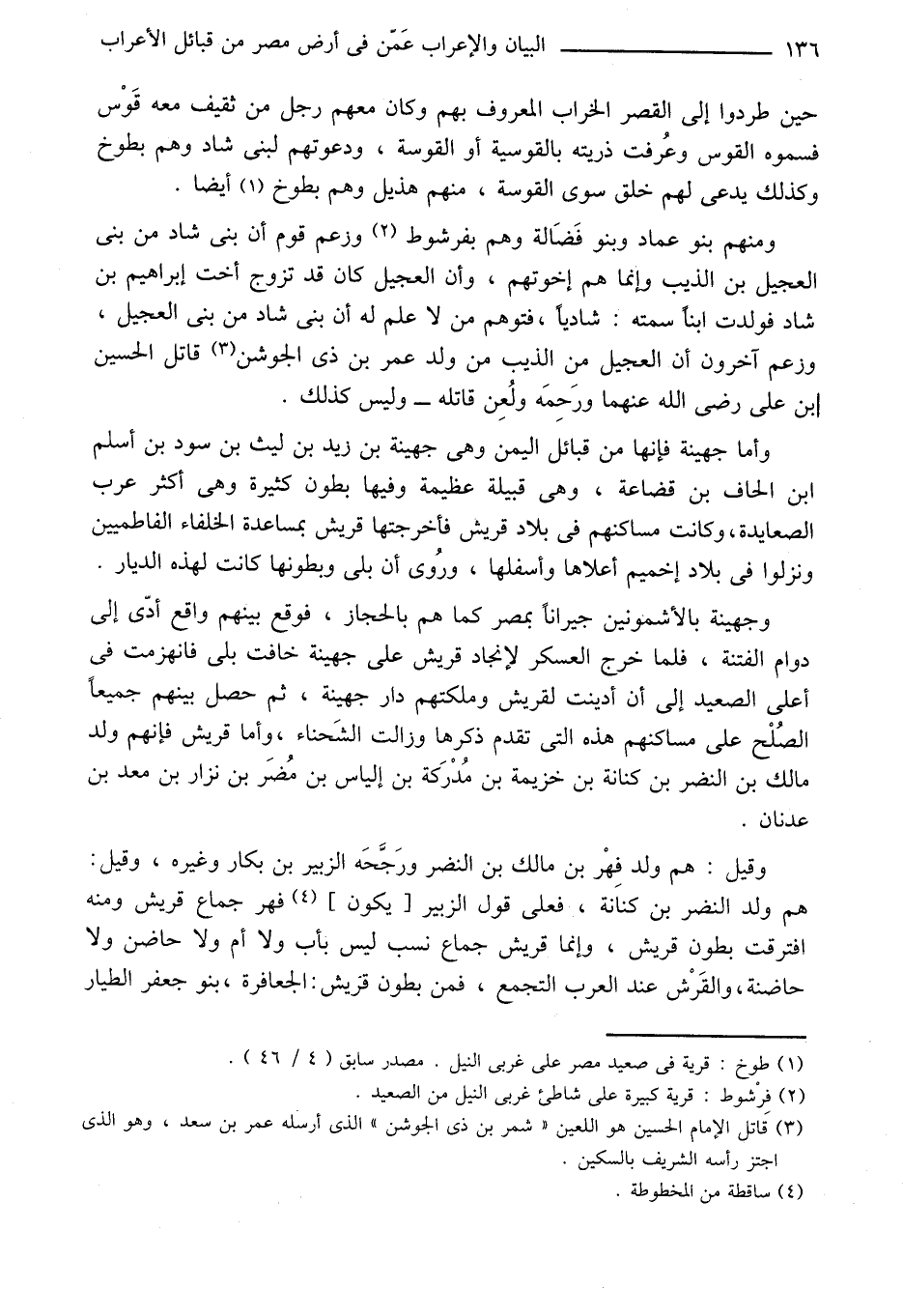 وجهينة بالأشمونين جيرانا بمصر كما هم بالحجاز، فوقع بينهم واقع أدّى إلى دوام الفتنة، فلما خرج العسكر لإنجاد قريش على جهينة خافت بلى فانهزمت في أعلى الصعيد إلى أن أدينت لقريش وملكتهم دار جهينة، ثم حصل بينهم جميعا الصلح على مساكنهم هذه التى تقدم ذكرها وزالت الشحناء، وأما قريش فإنهم ولد مالك بن النضر بن كنانة بن خزيمة بن مدركة بن إلياس بن مضر بن نزار بن معد بن عدنان.