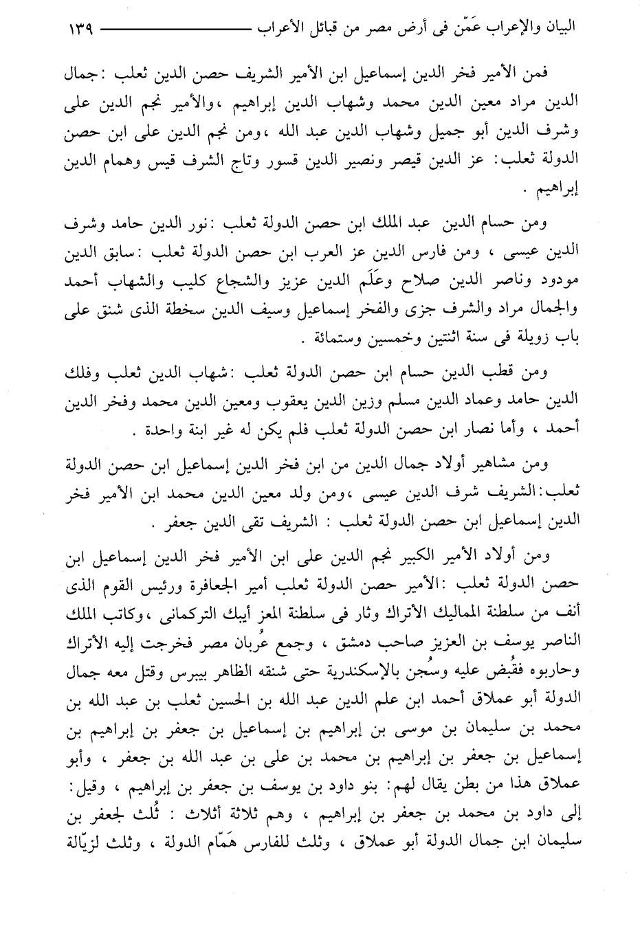 فمن الأمير فخر الدين إسماعيل ابن الأمير الشريف حصن الدين ثعلب: جمال الدين مراد معين الدين محمد وشهاب الدين إبراهيم، والأمير نجم الدين على وشرف الدين أبو جميل وشهاب الدين عبد الله، ومن نجم الدين على ابن حصن الدولة ثعلب: عز الدين قيصر ونصير الدين قسور وتاج الشرف قيس وهمام الدين إبراهيم.