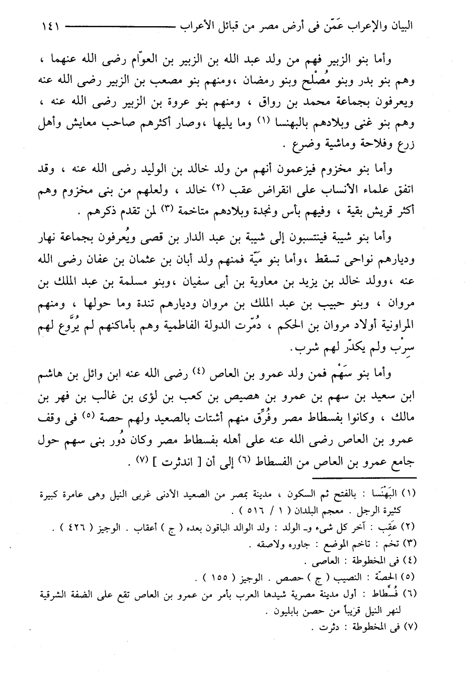 وأما بنو الزبير فهم من ولد عبد الله بن الزبير بن العوّام رضى الله عنهما، وهم بنو بدر وبنو مصلح وبنو رمضان، ومنهم بنو مصعب بن الزبير رضى الله عنه ويعرفون بجماعة محمد بن رواق، ومنهم بنو عروة بن الزبير رضى الله عنه، وهم بنو غنى وبلادهم بالبهنسا «1» وما يليها، وصار أكثرهم صاحب معايش وأهل زرع وفلاحة وماشية وضرع.