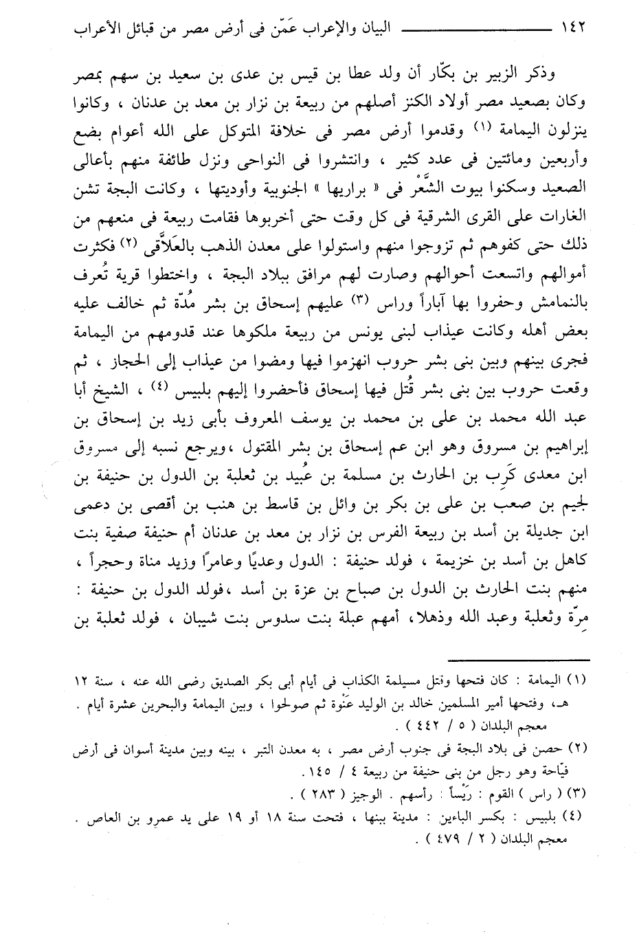 وذكر الزبير بن بكّار أن ولد عطا بن قيس بن عدى بن سعيد بن سهم بمصر وكان بصعيد مصر أولاد الكنز أصلهم من ربيعة بن نزار بن معد بن عدنان، وكانوا ينزلون اليمامة «1» وقدموا أرض مصر في خلافة المتوكل على الله أعوام بضع وأربعين ومائتين في عدد كثير، وانتشروا في النواحى ونزل طائفة منهم بأعالى الصعيد وسكنوا بيوت الشّعر في «براريها» الجنوبية وأوديتها، وكانت البجة تشن الغارات على القرى الشرقية في كل وقت حتى أخربوها فقامت ربيعة في منعهم من ذلك حتى كفوهم ثم تزوجوا منهم واستولوا على معدن الذهب بالعلّاقى «2» فكثرت أموالهم واتسعت أحوالهم وصارت لهم مرافق ببلاد البجة، واختطوا قرية تعرف بالنمامش وحفروا بها آبارا وراس «3» عليهم إسحاق بن بشر مدّة ثم خالف عليه بعض أهله وكانت عيذاب لبنى يونس من ربيعة ملكوها عند قدومهم من اليمامة فجرى بينهم وبين بنى بشر حروب انهزموا فيها ومضوا من عيذاب إلى الحجاز، ثم وقعت حروب بين بنى بشر قتل فيها إسحاق فأحضروا إليهم بلبيس «4» ، الشيخ أبا عبد الله محمد بن على بن محمد بن يوسف المعروف بأبى زيد بن إسحاق بن إبراهيم بن مسروق وهو ابن عم إسحاق بن بشر المقتول، ويرجع نسبه إلى مسروق ابن معدى كرب بن الحارث بن مسلمة بن عبيد بن ثعلبة بن الدول بن حنيفة بن لجيم بن صعب بن على بن بكر بن وائل بن قاسط بن هنب بن أقصى بن دعمى ابن جديلة بن أسد بن ربيعة الفرس بن نزار بن معد بن عدنان أم حنيفة صفية بنت كاهل بن أسد بن خزيمة، فولد حنيفة: الدول وعديا وعامرا وزيد مناة وحجرا، منهم بنت الحارث بن الدول بن صباح بن عزة بن أسد، فولد الدول بن حنيفة: