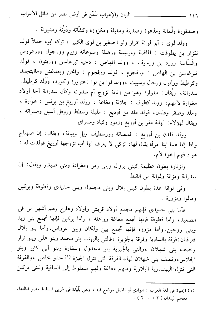 فأما بنى حديدى فإنهم مجمع أولاد قريش وأولاد زعازع وهم أشهر من في الصعيد، وأما قطوفة فإنها تجمع مغاغة وواهلة، وأما بركين فإنها تجمع بنى زيد وبنى روحين، وأما مزورة فإنها تجمع بين ولكان وبين عرواس، وأما بنو بلال ففرقتان: فرقة بالساوية وفرقة بالجزيرة، فالتى بالبهنسا بنو محمد وبنو على وبنو نزار ونصف بنى شهلان، والتى بالجيزية بنو مجدول وسقارة وبنو أبى كثير وبنو الجلاس، ونصف بنى شهلان لهذه الفرقة التى تنزل الجيزة «1» حدو خاص، والفرقة التى تنزل البهنساوية البلارية ومنهم مغاغة ولهم سملوط إلى الساقية ولبنى بركين