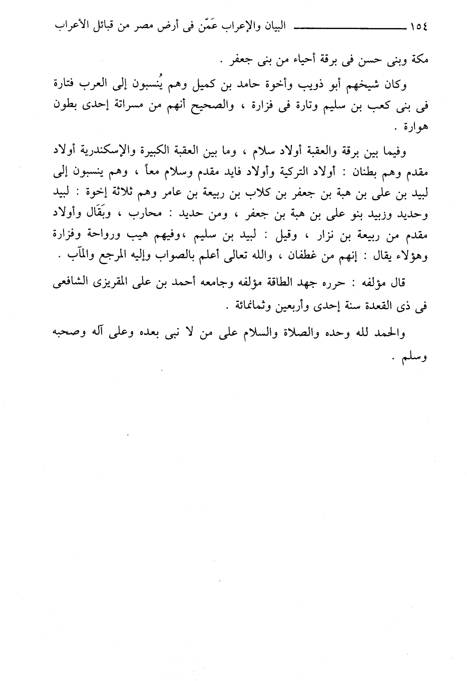 وفيما بين برقة والعقبة أولاد سلام، وما بين العقبة الكبيرة والإسكندرية أولاد مقدم وهم بطنان: أولاد التركية وأولاد فايد مقدم وسلام معا، وهم ينسبون إلى لبيد بن على بن هبة بن جعفر بن كلاب بن ربيعة بن عامر وهم ثلاثة إخوة: لبيد وحديد وزبيد بنو على بن هبة بن جعفر، ومن حديد: محارب، وبقال وأولاد مقدم من ربيعة بن نزار، وقيل: لبيد بن سليم، وفيهم هيب ورواحة وفزارة وهؤلاء يقال: إنهم من غطفان، والله تعالى أعلم بالصواب وإليه المرجع والمآب.