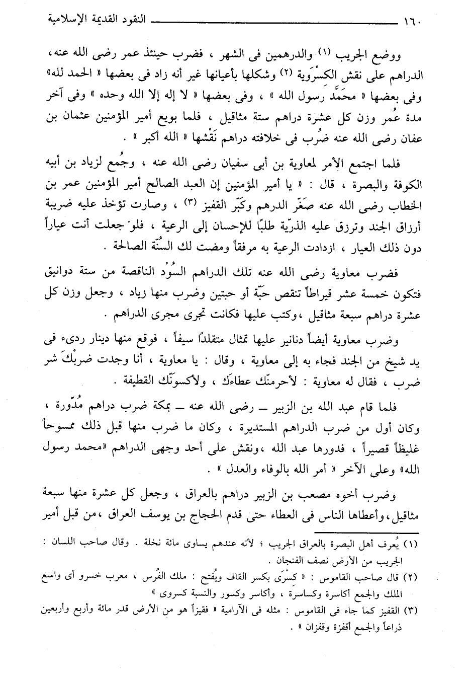 ووضع الجريب «1» والدرهمين في الشهر، فضرب حينئذ عمر رضى الله عنه، الدراهم على نقش الكسروية «2» وشكلها بأعيانها غير أنه زاد في بعضها «الحمد لله» وفي بعضها «محمّد رسول الله» ، وفي بعضها «لا إله إلا الله وحده» وفي آخر مدة عمر وزن كل عشرة دراهم ستة مثاقيل، فلما بويع أمير المؤمنين عثمان بن عفان رضى الله عنه ضرب في خلافته دراهم نقشها «الله أكبر» .