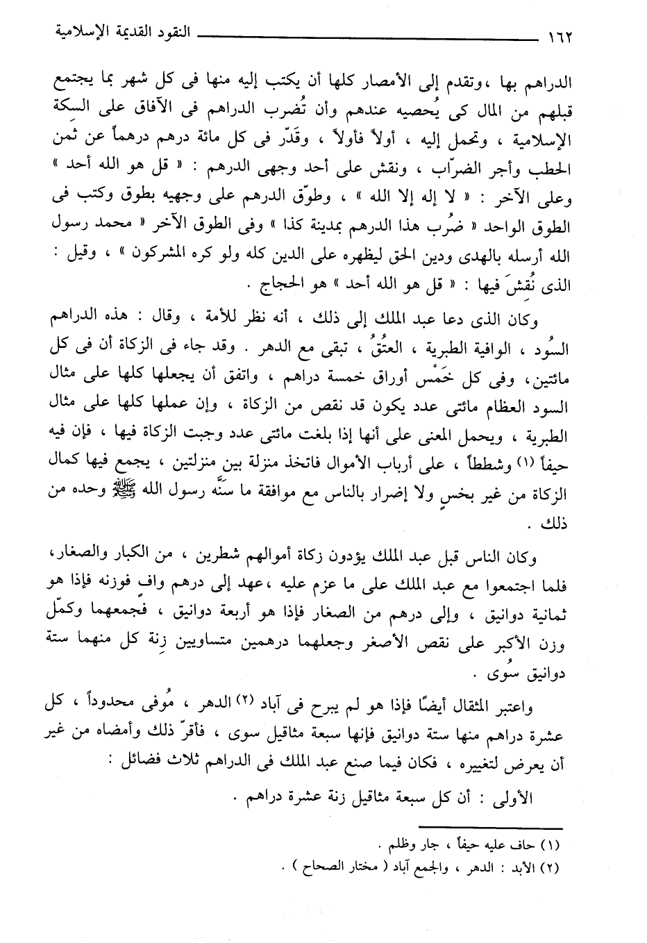 وكان الناس قبل عبد الملك يؤدون زكاة أموالهم شطرين، من الكبار والصغار، فلما اجتمعوا مع عبد الملك على ما عزم عليه، عهد إلى درهم واف فوزنه فإذا هو ثمانية دوانيق، وإلى درهم من الصغار فإذا هو أربعة دوانيق، فجمعهما وكمّل وزن الأكبر على نقص الأصغر وجعلهما درهمين متساويين زنة كل منهما ستة دوانيق سوى.