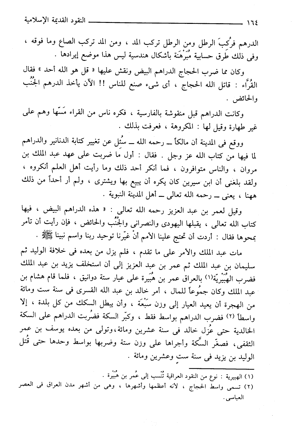 مات عبد الملك والأمر على ما تقدم، فلم يزل من بعده في خلافة الوليد ثم سليمان بن عبد الملك ثم عمر بن عبد العزيز إلى أن استخلف يزيد بن عبد الملك فضرب الهبيريّة «1» بالعراق عمر بن هبيرة على عيار ستة دوانيق، فلما قام هشام بن عبد الملك وكان جموعا للمال، أمر خالد بن عبد الله القسرى في سنة ست ومائة من الهجرة أن يعيد العيار إلى وزن سبعة، وأن يبطل السكك من كل بلدة، إلا واسطا «2» فضرب الدراهم بواسط فقط، وكبّر السكة فضربت الدراهم على السكة الخالدية حتى عزل خالد في سنة عشرين ومائة، وتولى من بعده يوسف بن عمر الثقفى، فصغّر السّكة وأجراها على وزن ستة وضربها بواسط وحدها حتى قتل الوليد بن يزيد في سنة ست وعشرين ومائة.