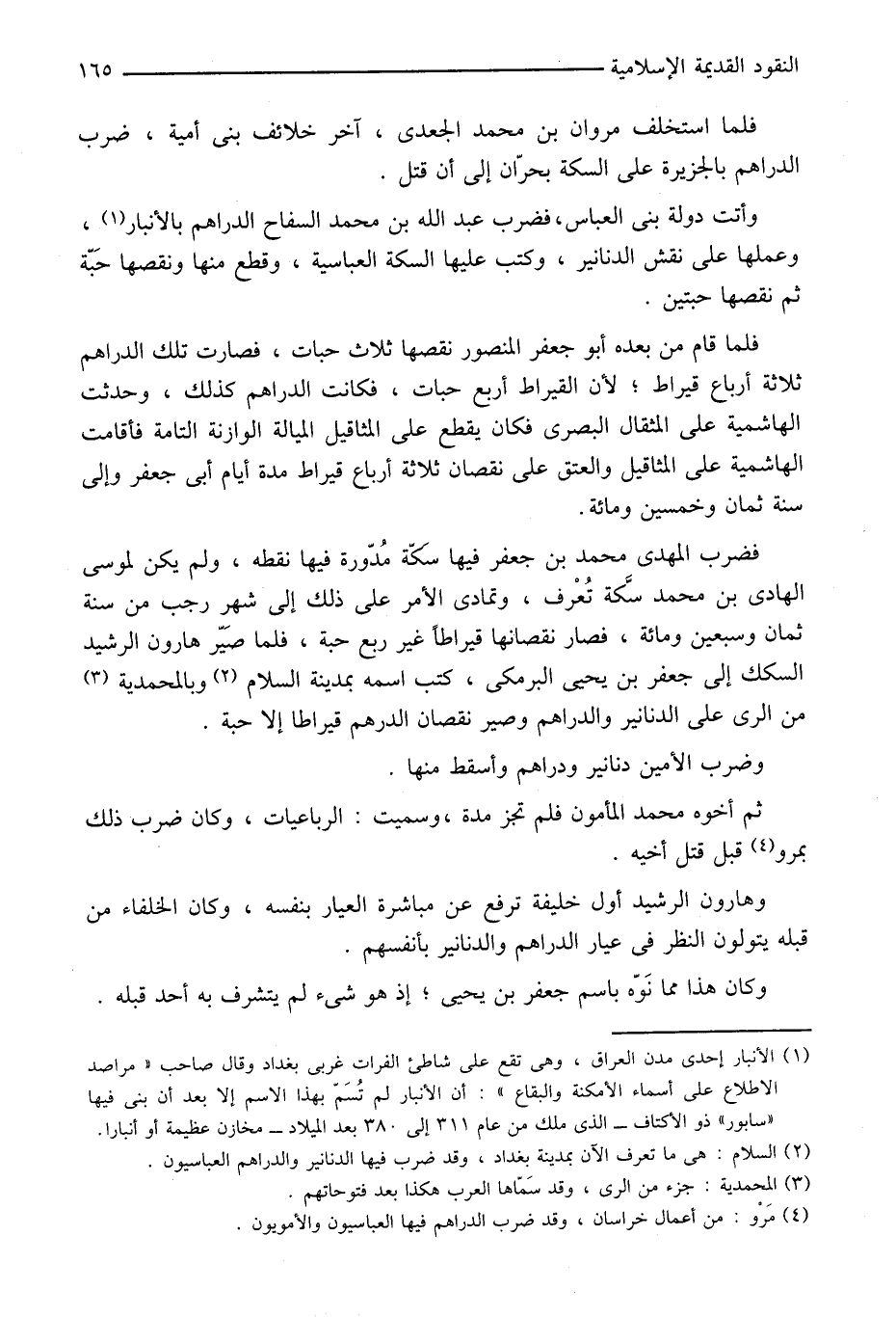 فضرب المهدى محمد بن جعفر فيها سكّة مدوّرة فيها نقطه، ولم يكن لموسى الهادى بن محمد سكّة تعرف، وتمادى الأمر على ذلك إلى شهر رجب من سنة ثمان وسبعين ومائة، فصار نقصانها قيراطا غير ربع حبة، فلما صيّر هارون الرشيد السكك إلى جعفر بن يحيى البرمكى، كتب اسمه بمدينة السلام «2» وبالمحمدية «3» من الرى على الدنانير والدراهم وصير نقصان الدرهم قيراطا إلا حبة.