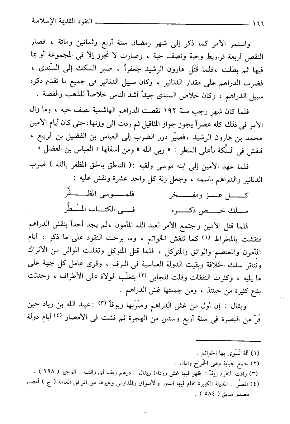 واستمر الأمر كما ذكر إلى شهر رمضان سنة أربع وثمانين ومائة، فصار النقص أربعة قراريط وحبة ونصف حبة، وصارت لا تجوز إلا في المجموعة أو بما فيها ثم بطلت، فلما قتل هارون الرشيد جعفرا، صير السكك إلى السندى، فضرب الدراهم على مقدار الدنانير، وكان سبيل الدنانير في جميع ما تقدم ذكره سبيل الدراهم، وكان خلاص السندى جيدا أشد الناس خلاصا للذهب والفضة.