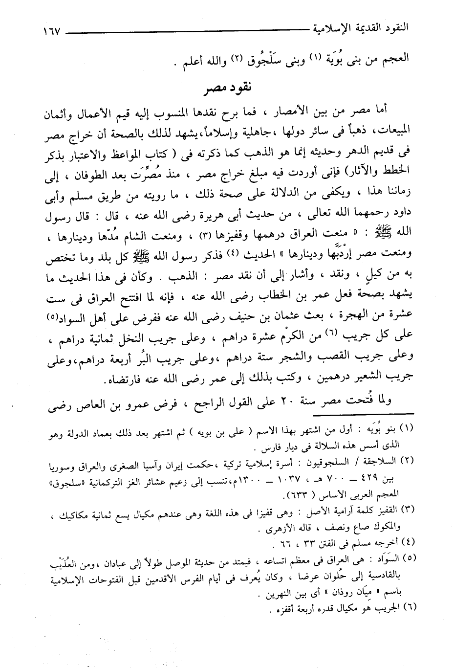 أما مصر من بين الأمصار، فما برح نقدها المنسوب إليه قيم الأعمال وأثمان المبيعات، ذهبا في سائر دولها، جاهلية وإسلاما، يشهد لذلك بالصحة أن خراج مصر فى قديم الدهر وحديثه إنما هو الذهب كما ذكرته في (كتاب المواعظ والاعتبار بذكر الخطط والآثار) فإنى أوردت فيه مبلغ خراج مصر، منذ مصرّت بعد الطوفان، إلى زماننا هذا، ويكفى من الدلالة على صحة ذلك، ما رويته من طريق مسلم وأبى داود رحمهما الله تعالى، من حديث أبى هريرة رضى الله عنه، قال: قال رسول الله صلى الله عليه وسلّم: «منعت العراق درهمها وقفيزها «3» ، ومنعت الشام مدّها ودينارها، ومنعت مصر إردبّها ودينارها» الحديث «4» فذكر رسول الله صلى الله عليه وسلّم كل بلد وما تختص به من كيل، ونقد، وأشار إلى أن نقد مصر: الذهب. وكأن في هذا الحديث ما يشهد بصحة فعل عمر بن الخطاب رضى الله عنه، فإنه لما افتتح العراق في ست عشرة من الهجرة، بعث عثمان بن حنيف رضى الله عنه ففرض على أهل السواد «5» على كل جريب «6» من الكرم عشرة دراهم، وعلى جريب النخل ثمانية دراهم، وعلى جريب القصب والشجر ستة دراهم، وعلى جريب البر أربعة دراهم، وعلى جريب الشعير درهمين، وكتب بذلك إلى عمر رضى الله عنه فارتضاه.