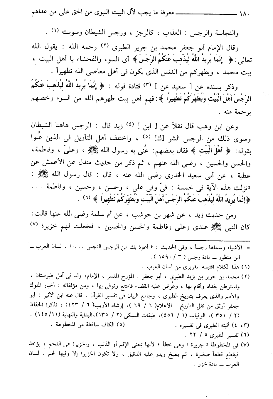 وقال الإمام أبو جعفر محمد بن جرير الطبرى «2» رحمه الله: يقول الله تعالى: إِنَّما يُرِيدُ اللَّهُ لِيُذْهِبَ عَنْكُمُ الرِّجْسَ