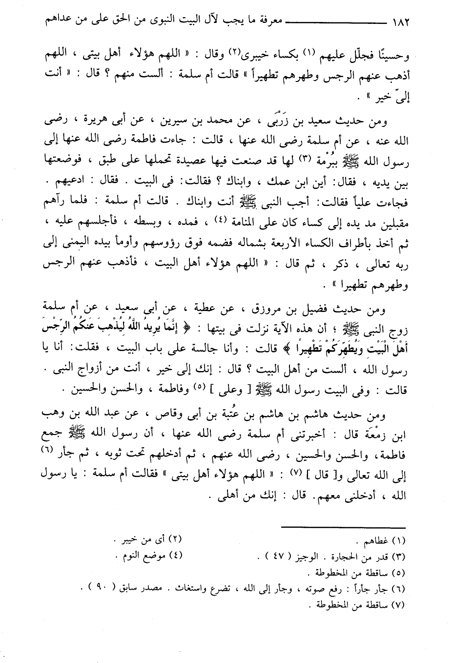 قالت: وفي البيت رسول الله صلى الله عليه وسلّم [وعلى] «5» وفاطمة، والحسن والحسين.