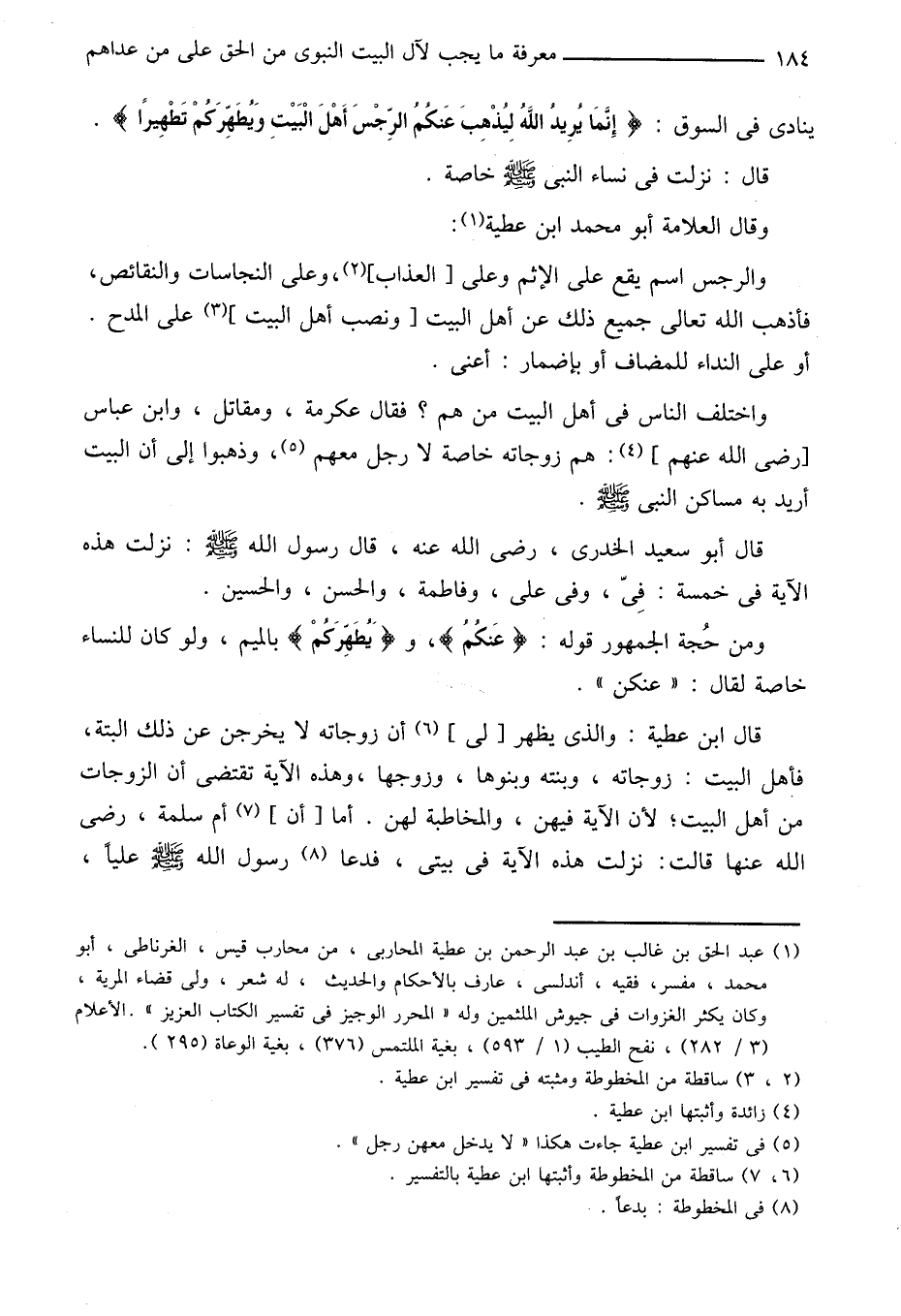 قال ابن عطية: والذى يظهر [لى] «6» أن زوجاته لا يخرجن عن ذلك البتة، فأهل البيت: زوجاته، وبنته وبنوها، وزوجها، وهذه الآية تقتضى أن الزوجات من أهل البيت؛ لأن الآية فيهن، والمخاطبة لهن. أما [أن] «7» أم سلمة، رضى الله عنها قالت: نزلت هذه الآية في بيتى، فدعا «8» رسول الله صلى الله عليه وسلّم عليا،
