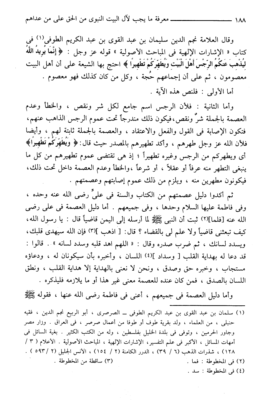 وقال العلامة نجم الدين سليمان بن عبد القوى بن عبد الكريم الطوفى «1» فى كتاب «الإشارات الإلهية في المباحث الأصولية» قوله عز وجل: إِنَّما يُرِيدُ اللَّهُ لِيُذْهِبَ عَنْكُمُ الرِّجْسَ أَهْلَ الْبَيْتِ وَيُطَهِّرَكُمْ تَطْهِيراً