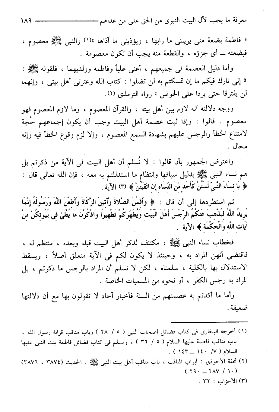 «فاطمة بضعة منى يريبنى ما رابها، ويؤذينى ما آذاها» «1» والنبى صلى الله عليه وسلّم معصوم، فبضعته- أى جزؤه، والقطعة منه يجب أن تكون معصومة.