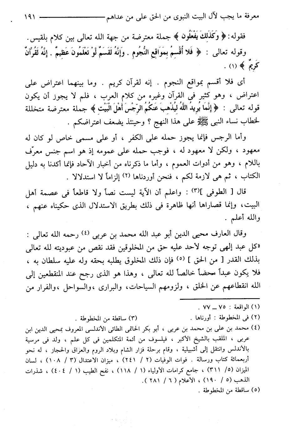 قال [الطوفى] «3» : واعلم أن الآية ليست نصا ولا قاطعا في عصمة أهل البيت، وإنما قصاراها أنها ظاهرة في ذلك بطريق الاستدلال الذى حكيناه عنهم، والله أعلم.
