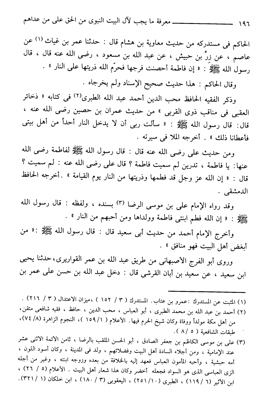 وذكر الفقيه الحافظ محب الدين أحمد عبد الله الطبرى «2» فى كتابه «ذخائر العقبى في مناقب ذوى القربى» من حديث عمران بن حصين رضى الله عنه، قال: قال رسول الله صلى الله عليه وسلّم: «سألت ربى أن لا يدخل النار أحدا من أهل بيتى فأعطانا ذلك» . أخرجه الملا في سيرته.
