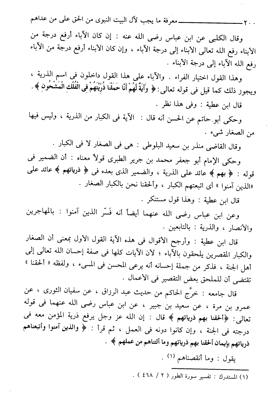 قال جامعه: خرّج الحاكم من حديث عبد الرزاق، عن سفيان الثورى، عن عمرو بن مرة، عن سعيد بن جبير، عن ابن عباس رضى الله عنهما في قوله تعالى: أَلْحَقْنا بِهِمْ ذُرِّيَّتَهُمْ