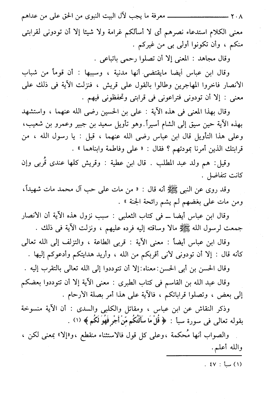 وقال بهذا المعنى في هذه الآية: على بن الحسين رضى الله عنهما، واستشهد بهذه الآية حين سيق إلى الشام أسيرا. وهو تأويل سعيد بن جبير وعمرو بن شعيب، وعلى هذا التأويل قال ابن عباس رضى الله عنهما، قيل: يا رسول الله، من قرابتك الذين أمرنا بمودتهم؟ فقال: «على وفاطمة وابناهما» .