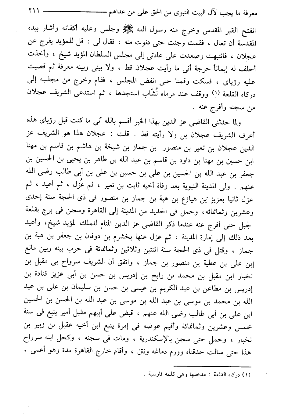 ولما حدثنى القاضى عز الدين بهذا الخبر أقسم بالله أنى ما كنت قبل رؤياى هذه أعرف الشريف عجلان بل ولا رأيته قط. قلت: عجلان هذا هو الشريف عز الدين عجلان بن تعير بن منصور بن جماز بن شيخة بن هاشم بن قاسم بن مهنا ابن حسين بن مهنا بن داود بن قاسم بن عبد الله بن طاهر بن يحيى بن الحسين بن جعفر بن عبد الله بن الحسين بن على بن حسين بن على بن أبى طالب رضى الله عنهم. ولى المدينة النبوية بعد وفاة أخيه ثابت بن تعير، ثم عزل، ثم أعيد، ثم عزل ثانيا بعزيز بن هيازع بن هبة بن جماز بن منصور في ذى الحجة سنة إحدى وعشرين وثمانمائه، وحمل في الحديد من المدينة إلى القاهرة وسجن في برج بقلعة الجبل حتى أفرج عنه عند ما ذكر القاضى عز الدين المنام للملك المؤيد شيخ، وأعيد بعد ذلك إلى إمارة المدينة، ثم عزل عنها بخشرم بن دوفان بن جعفر بن هبة بن جماز، وقتل في ذى الحجة سنة اثنتين وثلاثين وثمانمائة في حرب بينه وبين مانع ابن على بن عطية بن منصور بن جماز، واتفق أن الشريف سرواح بى مقبل بن نخبار ابن مقبل بن محمد بن رابح بن إدريس بن حسن بن أبى عزيز قتادة بن إدريس بن مطاعن بن عبد الكريم بن عيسى بن حسن بن سليمان بن على بن عبد الله بن محمد بن موسى بن عبد الله بن موسى بن عبد الله بن الحسن بن الحسين ابن على بن أبى طالب رضى الله عنهم، قبض على أبيهم مقبل أمير ينبع في سنة خمس وعشرين وثمانمائة وأقيم عوضه في إمرة ينبع ابن أخيه عقيل بن زبير بن نخبار، وحمل حتى سجن بالإسكندرية، ومات في سجنه، وكحل ابنه سرواح هذا حتى سالت حدقتاه وورم دماغه ونتن، وأقام خارج القاهرة مدة وهو أعمى،