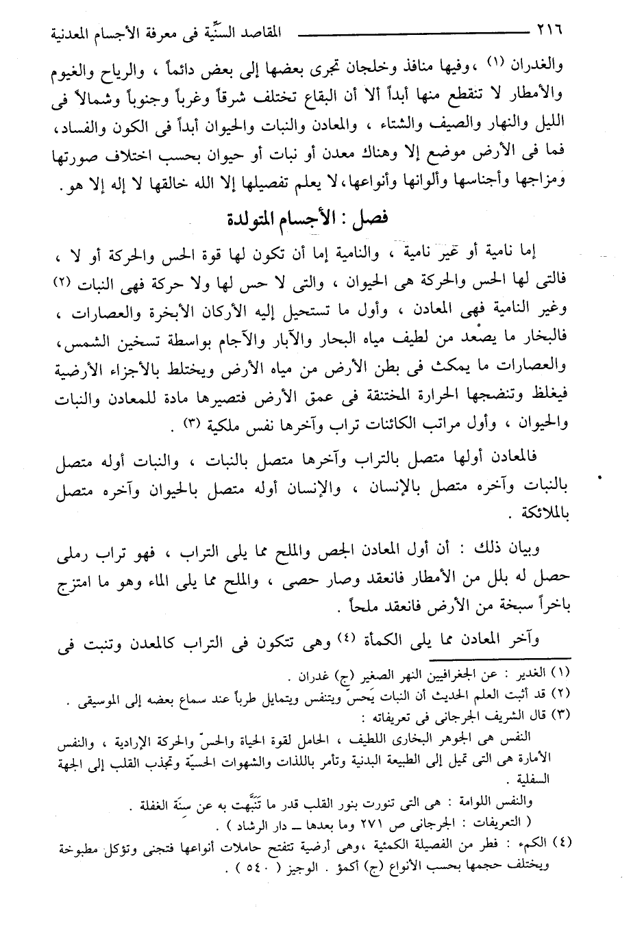 إما نامية أو غير نامية، والنامية إما أن تكون لها قوة الحس والحركة أو لا، فالتى لها الحس والحركة هى الحيوان، والتى لا حس لها ولا حركة فهى النبات «2» وغير النامية فهى المعادن، وأول ما تستحيل إليه الأركان الأبخرة والعصارات، فالبخار ما يصعد من لطيف مياه البحار والآبار والآجام بواسطة تسخين الشمس، والعصارات ما يمكث في بطن الأرض من مياه الأرض ويختلط بالأجزاء الأرضية فيغلظ وتنضجها الحرارة المختنقة في عمق الأرض فتصيرها مادة للمعادن والنبات والحيوان، وأول مراتب الكائنات تراب وآخرها نفس ملكية «3» .