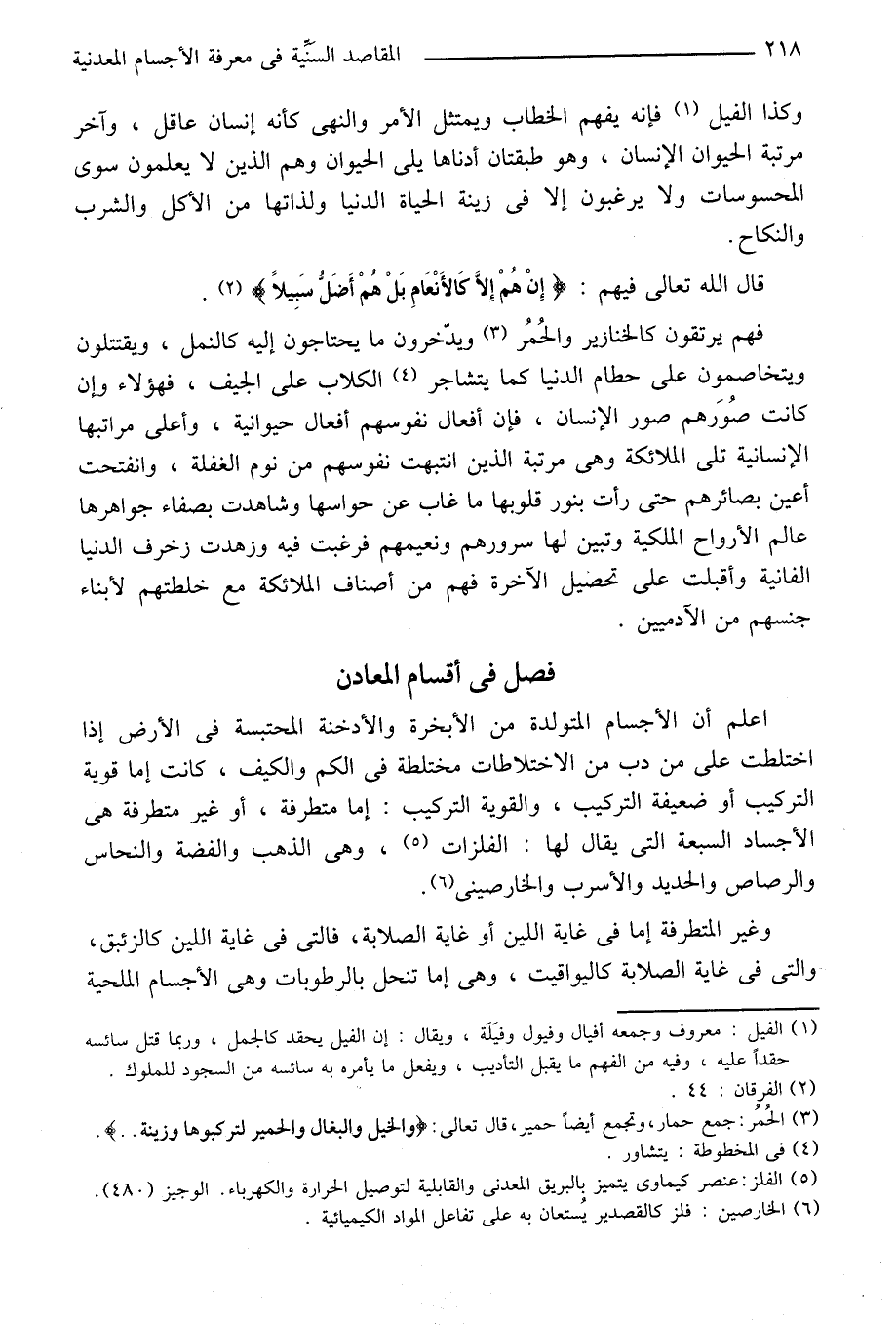 وكذا الفيل «1» فإنه يفهم الخطاب ويمتثل الأمر والنهى كأنه إنسان عاقل، وآخر مرتبة الحيوان الإنسان، وهو طبقتان أدناها يلى الحيوان وهم الذين لا يعلمون سوى المحسوسات ولا يرغبون إلا في زينة الحياة الدنيا ولذاتها من الأكل والشرب والنكاح.
