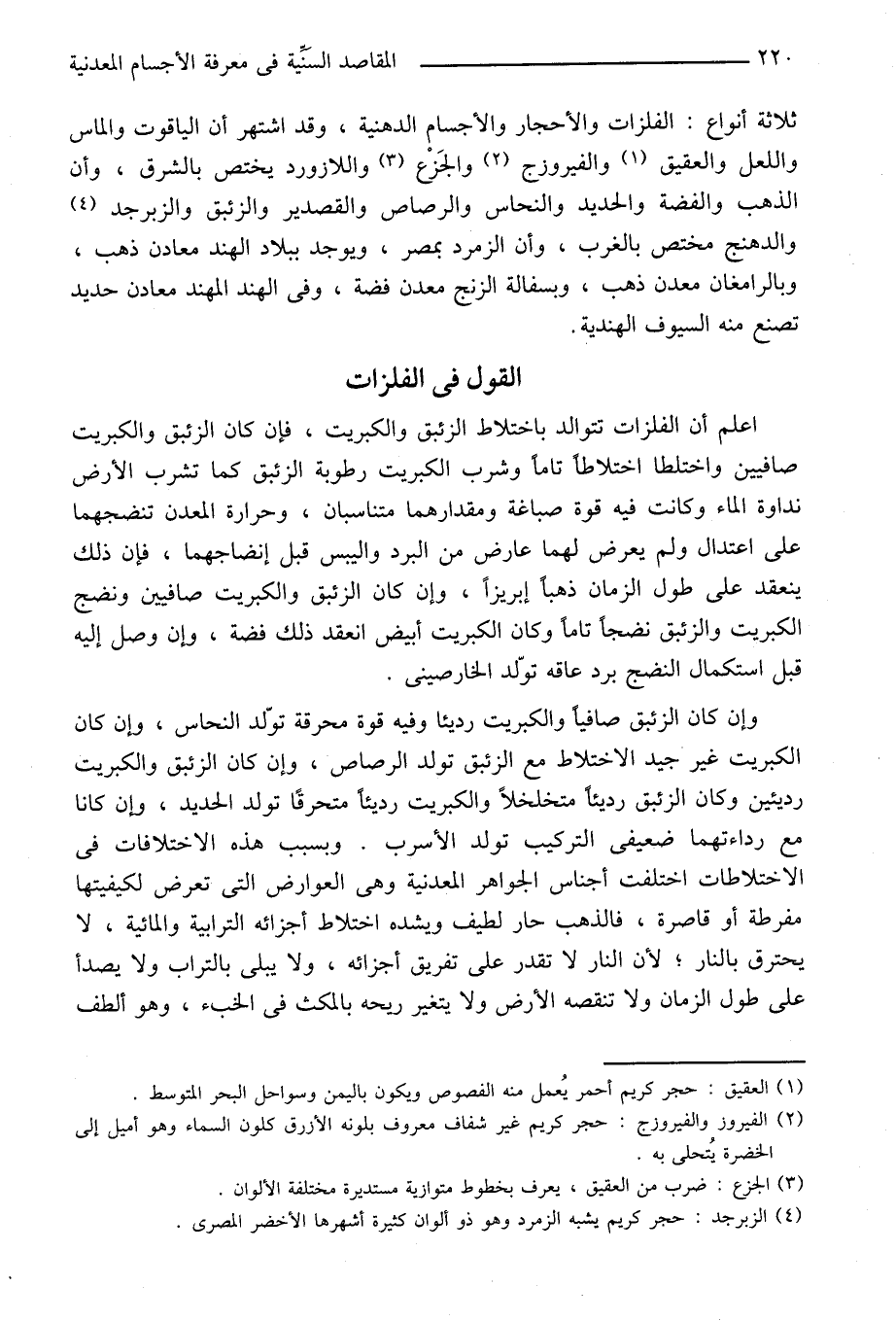 اعلم أن الفلزات تتوالد باختلاط الزئبق والكبريت، فإن كان الزئبق والكبريت صافيين واختلطا اختلاطا تاما وشرب الكبريت رطوبة الزئبق كما تشرب الأرض نداوة الماء وكانت فيه قوة صباغة ومقدارهما متناسبان، وحرارة المعدن تنضجهما على اعتدال ولم يعرض لهما عارض من البرد واليبس قبل إنضاجهما، فإن ذلك ينعقد على طول الزمان ذهبا إبريزا، وإن كان الزئبق والكبريت صافيين ونضج الكبريت والزئبق نضجا تاما وكان الكبريت أبيض انعقد ذلك فضة، وإن وصل إليه قبل استكمال النضج برد عاقه توّلد الخارصينى.