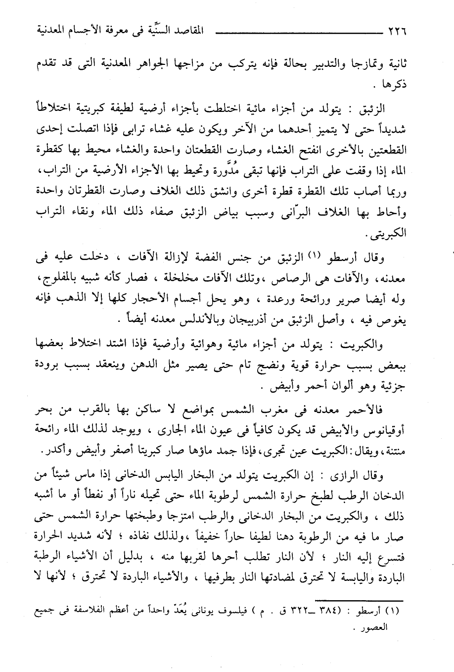 الزئبق: يتولد من أجزاء مائية اختلطت بأجزاء أرضية لطيفة كبريتية اختلاطا شديدا حتى لا يتميز أحدهما من الآخر ويكون عليه غشاء ترابى فإذا اتصلت إحدى القطعتين بالأخرى انفتح الغشاء وصارت القطعتان واحدة والغشاء محيط بها كقطرة الماء إذا وقفت على التراب فإنها تبقى مدّورة وتحيط بها الأجزاء الأرضية من التراب، وربما أصاب تلك القطرة قطرة أخرى وانشق ذلك الغلاف وصارت القطرتان واحدة وأحاط بها الغلاف البرّانى وسبب بياض الزئبق صفاء ذلك الماء ونقاء التراب الكبريتى.