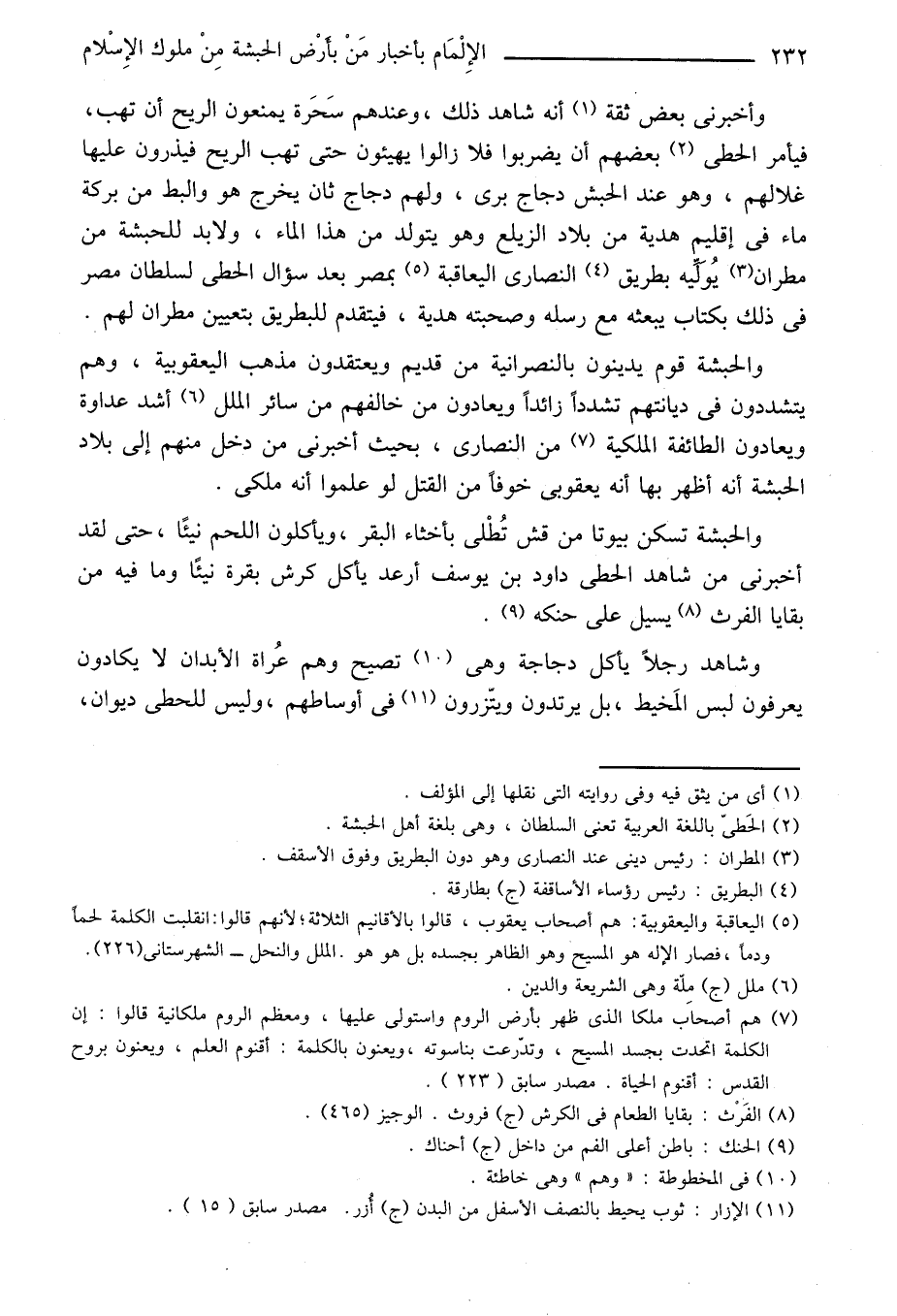 والحبشة قوم يدينون بالنصرانية من قديم ويعتقدون مذهب اليعقوبية، وهم يتشددون في ديانتهم تشددا زائدا ويعادون من خالفهم من سائر الملل «6» أشد عداوة ويعادون الطائفة الملكية «7» من النصارى، بحيث أخبرنى من دخل منهم إلى بلاد الحبشة أنه أظهر بها أنه يعقوبى خوفا من القتل لو علموا أنه ملكى.