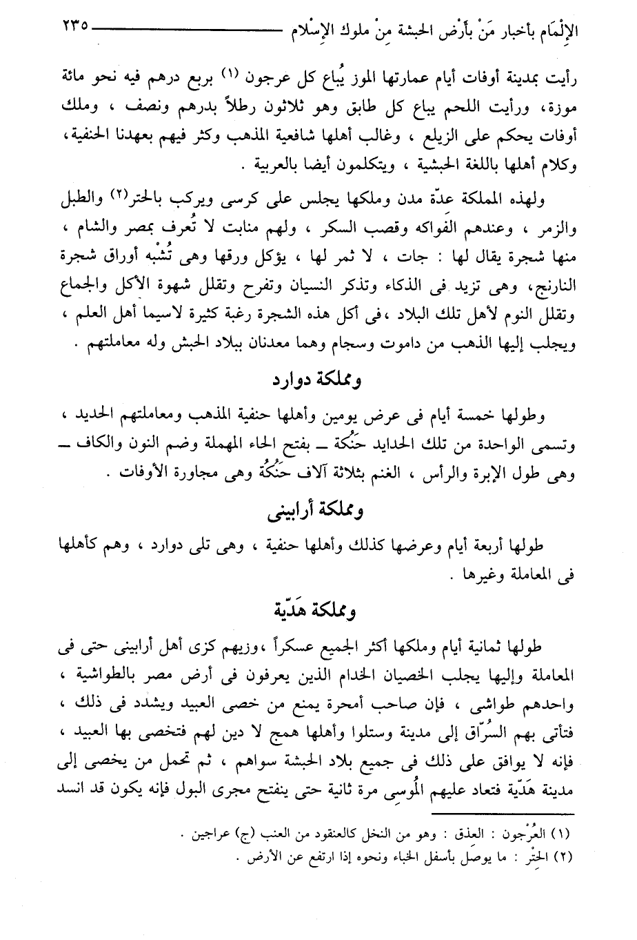 ولهذه المملكة عدّة مدن وملكها يجلس على كرسى ويركب بالحتر «2» والطبل والزمر، وعندهم الفواكه وقصب السكر، ولهم منابت لا تعرف بمصر والشام، منها شجرة يقال لها: جات، لا ثمر لها، يؤكل ورقها وهى تشبه أوراق شجرة النارنج، وهى تزيد في الذكاء وتذكر النسيان وتفرح وتقلل شهوة الأكل والجماع وتقلل النوم لأهل تلك البلاد، فى أكل هذه الشجرة رغبة كثيرة لا سيما أهل العلم، ويجلب إليها الذهب من داموت وسجام وهما معدنان ببلاد الحبش وله معاملتهم.