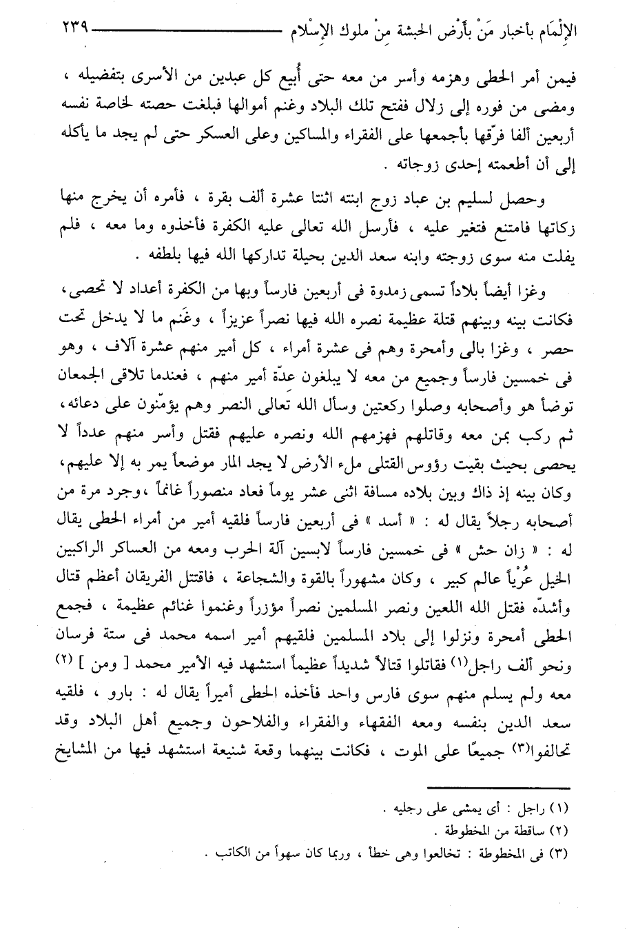 وغزا أيضا بلادا تسمى زمدوة في أربعين فارسا وبها من الكفرة أعداد لا تحصى، فكانت بينه وبينهم قتلة عظيمة نصره الله فيها نصرا عزيزا، وغنم ما لا يدخل تحت حصر، وغزا بالى وأمحرة وهم في عشرة أمراء، كل أمير منهم عشرة آلاف، وهو فى خمسين فارسا وجميع من معه لا يبلغون عدّة أمير منهم، فعندما تلاقى الجمعان توضأ هو وأصحابه وصلوا ركعتين وسأل الله تعالى النصر وهم يؤمّنون على دعائه، ثم ركب بمن معه وقاتلهم فهزمهم الله ونصره عليهم فقتل وأسر منهم عددا لا يحصى بحيث بقيت رؤوس القتلى ملء الأرض لا يجد المار موضعا يمر به إلا عليهم، وكان بينه إذ ذاك وبين بلاده مسافة اثنى عشر يوما فعاد منصورا غانما، وجرد مرة من أصحابه رجلا يقال له: «أسد» فى أربعين فارسا فلقيه أمير من أمراء الحطى يقال له: «زان حش» فى خمسين فارسا لابسين آلة الحرب ومعه من العساكر الراكبين الخيل عريا عالم كبير، وكان مشهورا بالقوة والشجاعة، فاقتتل الفريقان أعظم قتال وأشدّه فقتل الله اللعين ونصر المسلمين نصرا مؤزرا وغنموا غنائم عظيمة، فجمع الحطى أمحرة ونزلوا إلى بلاد المسلمين فلقيهم أمير اسمه محمد في ستة فرسان ونحو ألف راجل «1» فقاتلوا قتالا شديدا عظيما استشهد فيه الأمير محمد [ومن] «2» معه ولم يسلم منهم سوى فارس واحد فأخذه الحطى أميرا يقال له: بارو، فلقيه سعد الدين بنفسه ومعه الفقهاء والفقراء والفلاحون وجميع أهل البلاد وقد تحالفوا «3» جميعا على الموت، فكانت بينهما وقعة شنيعة استشهد فيها من المشايخ