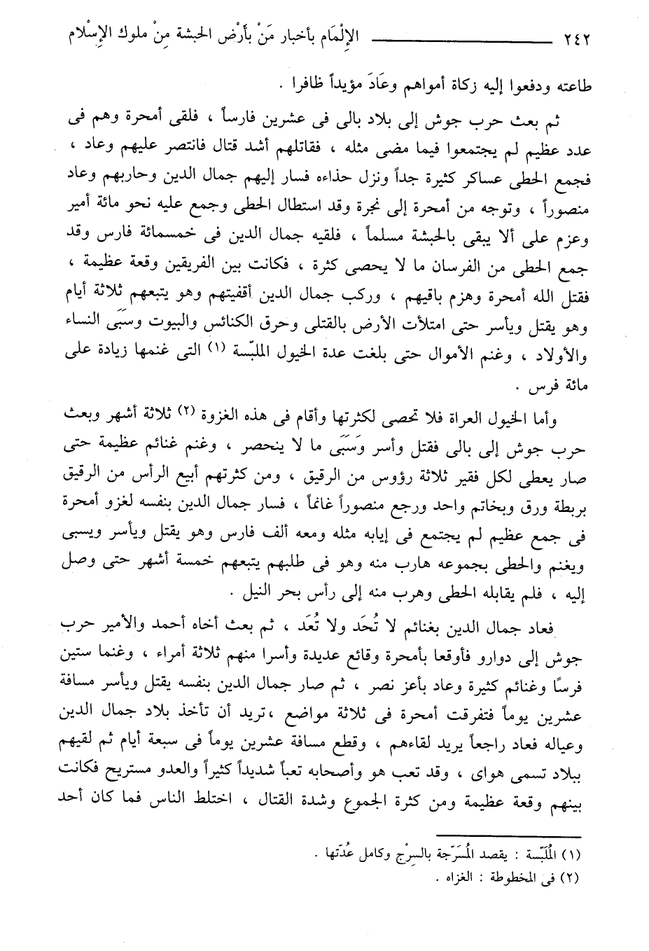 ثم بعث حرب جوش إلى بلاد بالى في عشرين فارسا، فلقى أمحرة وهم في عدد عظيم لم يجتمعوا فيما مضى مثله، فقاتلهم أشد قتال فانتصر عليهم وعاد، فجمع الحطى عساكر كثيرة جدا ونزل حذاءه فسار إليهم جمال الدين وحاربهم وعاد منصورا، وتوجه من أمحرة إلى نجرة وقد استطال الحطى وجمع عليه نحو مائة أمير وعزم على الا يبقى بالحبشة مسلما، فلقيه جمال الدين في خمسمائة فارس وقد جمع الحطى من الفرسان ما لا يحصى كثرة، فكانت بين الفريقين وقعة عظيمة، فقتل الله أمحرة وهزم باقيهم، وركب جمال الدين أقفيتهم وهو يتبعهم ثلاثة أيام وهو يقتل ويأسر حتى امتلأت الأرض بالقتلى وحرق الكنائس والبيوت وسبى النساء والأولاد، وغنم الأموال حتى بلغت عدة الخيول الملبّسة «1» التى غنمها زيادة على مائة فرس.