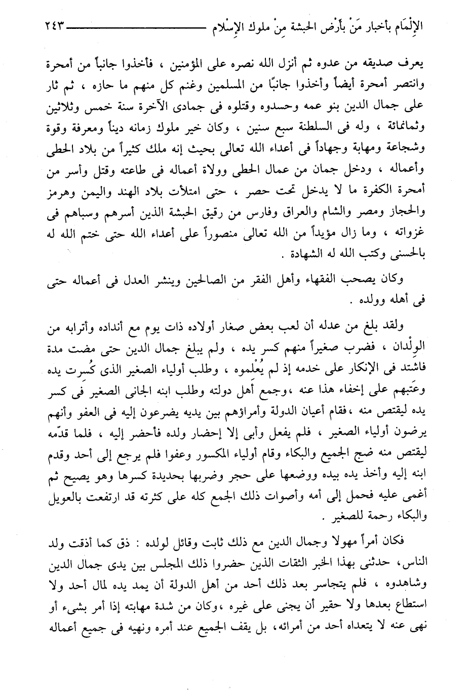 يعرف صديقه من عدوه ثم أنزل الله نصره على المؤمنين، فأخذوا جانبا من أمحرة وانتصر أمحرة أيضا وأخذوا جانبا من المسلمين وغنم كل منهم ما حازه، ثم ثار على جمال الدين بنو عمه وحسدوه وقتلوه في جمادى الآخرة سنة خمس وثلاثين وثمانمائة، وله في السلطنة سبع سنين، وكان خير ملوك زمانه دينا ومعرفة وقوة وشجاعة ومهابة وجهادا في أعداء الله تعالى بحيث إنه ملك كثيرا من بلاد الحطى وأعماله، ودخل جمان من عمال الحطى وولاة أعماله في طاعته وقتل وأسر من أمحرة الكفرة ما لا يدخل تحت حصر، حتى امتلأت بلاد الهند واليمن وهرمز والحجاز ومصر والشام والعراق وفارس من رقيق الحبشة الذين أسرهم وسباهم في غزاته، وما زال مؤيدا من الله تعالى منصورا على أعداء الله حتى ختم الله له بالحسنى وكتب الله له الشهادة.
