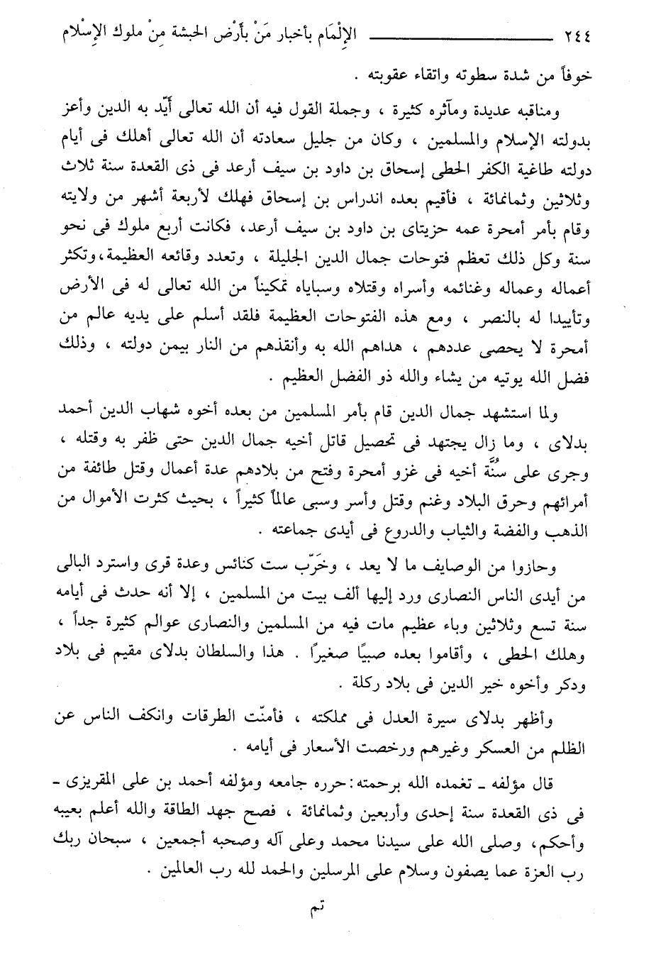 قال مؤلفه- تغمده الله برحمته: حرره جامعه ومؤلفه أحمد بن على المقريزى- فى ذى القعدة سنة إحدى وأربعين وثمانمائة، فصح جهد الطاقة والله أعلم بعيبه وأحكم، وصلى الله على سيدنا محمد وعلى آله وصحبه أجمعين، سبحان ربك رب العزة عما يصفون وسلام على المرسلين والحمد الله رب العالمين.