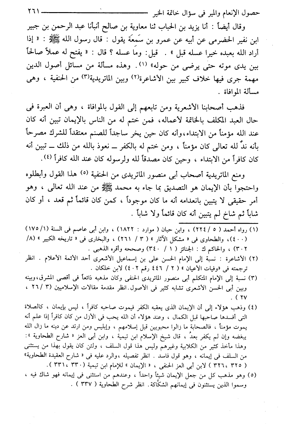 وقال أيضا: أنا يزيد بن الحباب ثنا معاوية بن صالح أنبأنا عبد الرحمن بن جبير ابن نفير الحضرمى عن أبيه عن عمرو بن سمعة يقول: قال رسول الله صلى الله عليه وسلّم: «إذا أراد الله بعبده خيرا عسله قبله» . قيل: وما عسله؟ قال: «يفتح له عملا صالحا بين يدى موته حتى يرضى من حوله» «1» . وهذه مسألة من مسائل أصول الدين مهمة جرى فيها خلاف كبير بين الأشاعرة «2» وبين الماتريدية «3» من الحنيفة، وهى مسألة الموافاة.