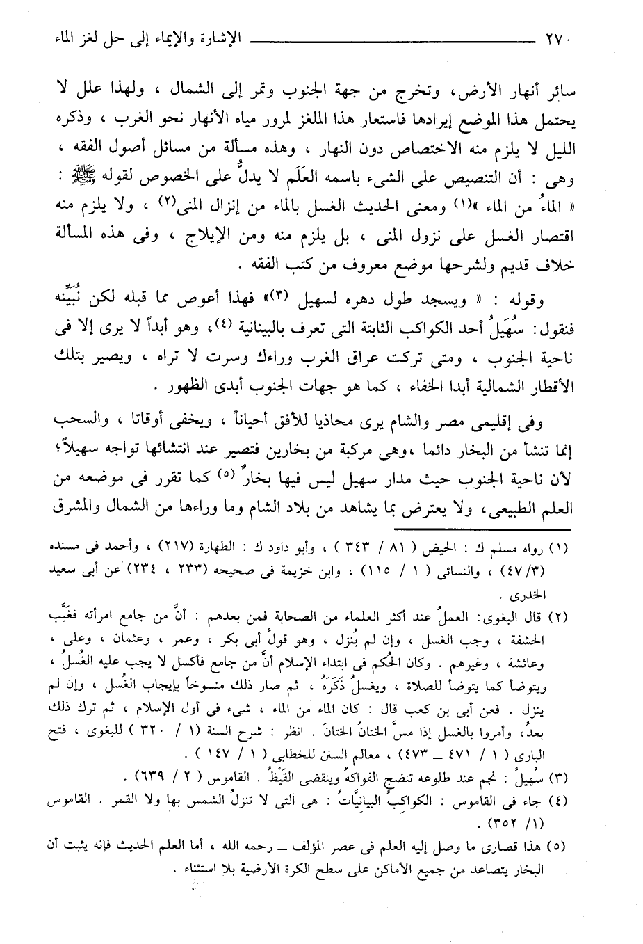 وفي إقليمى مصر والشام يرى محاذيا للأفق أحيانا، ويخفى أوقاتا، والسحب إنما تنشأ من البخار دائما، وهى مركبة من بخارين فتصير عند انتشائها تواجه سهيلا؛ لأن ناحية الجنوب حيث مدار سهيل ليس فيها بخار «5» كما تقرر في موضعه من العلم الطبيعى، ولا يعترض بما يشاهد من بلاد الشام وما وراءها من الشمال والمشرق