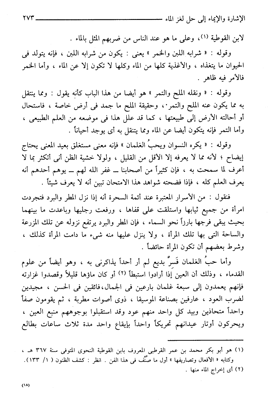 وأما حب الغلمان فسر بديع لم أر أحدا يذكرانى به، وهو أيضا من علوم القدماء، وذلك أن العين إذا أرادوا استبطا «2» أو كان ماؤها قليلا وقصدوا غزارته فإنهم يعمدون إلى سبعة غلمان بارعين في الجمال، فائقين في الحسن، مجيدين لضرب العود، عارفين بصناعة الموسيقا، ذوى أصوات مطربة، ثم يقومون صفا واحدا متحاذين وبيد كل واحد منهم عود وقد استقبلوا بوجوههم منبع العين، ويحركون أوتار عيدانهم تحريكا واحدا بإيقاع واحد مدة ثلاث ساعات بطالع
