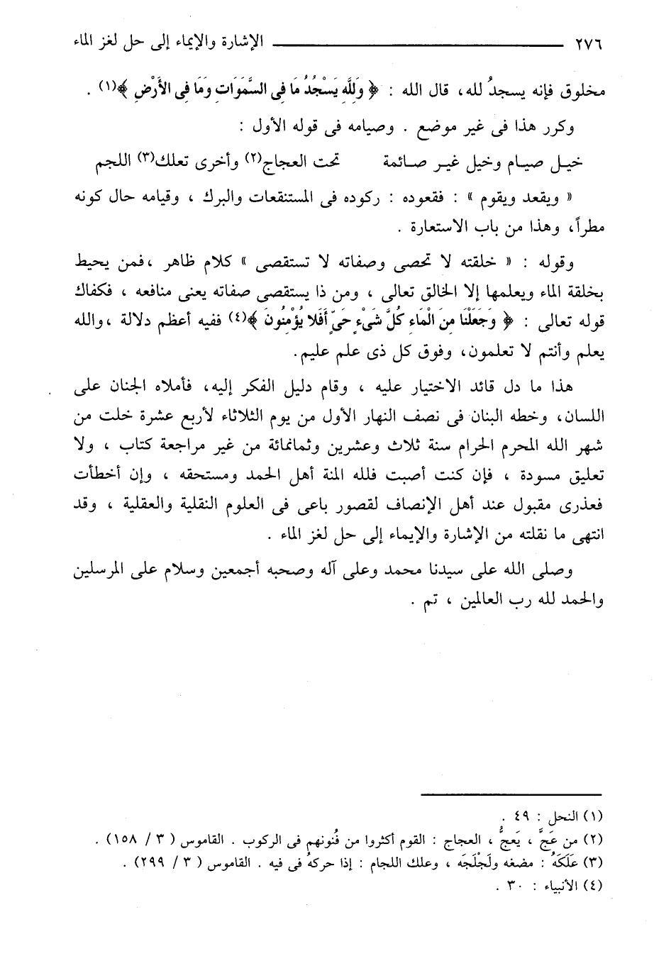 هذا ما دل قائد الاختيار عليه، وقام دليل الفكر إليه، فأملاه الجنان على اللسان، وخطه البنان في نصف النهار الأول من يوم الثلاثاء لأربع عشرة خلت من شهر الله المحرم الحرام سنة ثلاث وعشرين وثمانمائة من غير مراجعة كتاب، ولا تعليق مسودة، فإن كنت أصبت فلله المنة أهل الحمد ومستحقه، وإن أخطأت فعذرى مقبول عند أهل الإنصاف لقصور باعى في العلوم النقلية والعقلية، وقد انتهى ما نقلته من الإشارة والإيماء إلى حل لغز الماء.