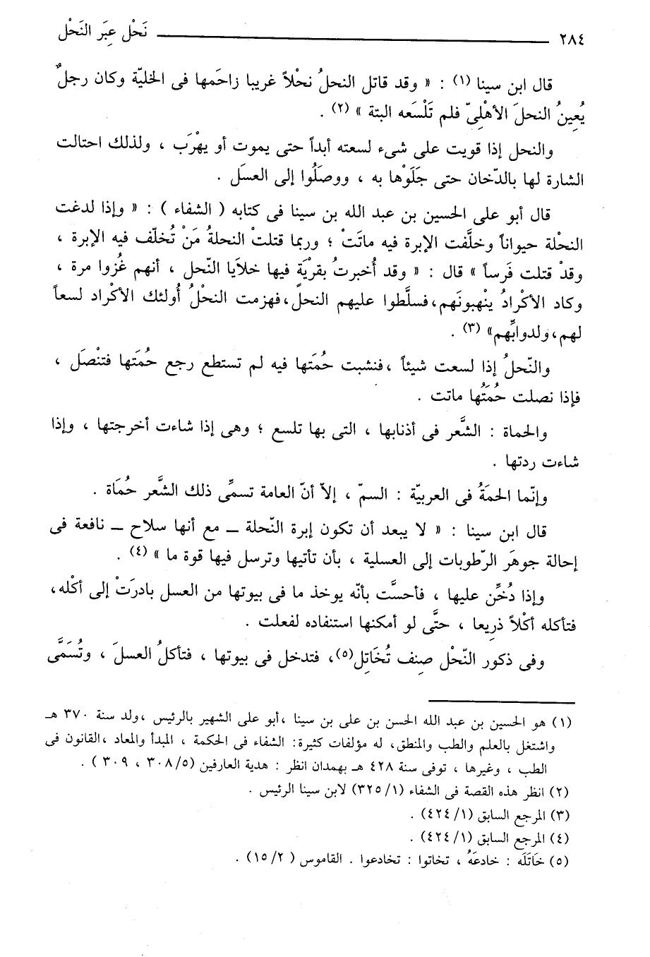 قال أبو على الحسين بن عبد الله بن سينا في كتابه (الشفاء) : «وإذا لدغت النحلة حيوانا وخلّفت الإبرة فيه ماتت؛ وربما قتلت النحلة من تخلّف فيه الإبرة، وقد قتلت فرسا» قال: «وقد أخبرت بقرية فيها خلايا النّحل، أنهم غزوا مرة، وكاد الأكراد ينهبونهم، فسلّطوا عليهم النحل، فهزمت النحل أولئك الأكراد لسعا لهم، ولدوابّهم» «3» .