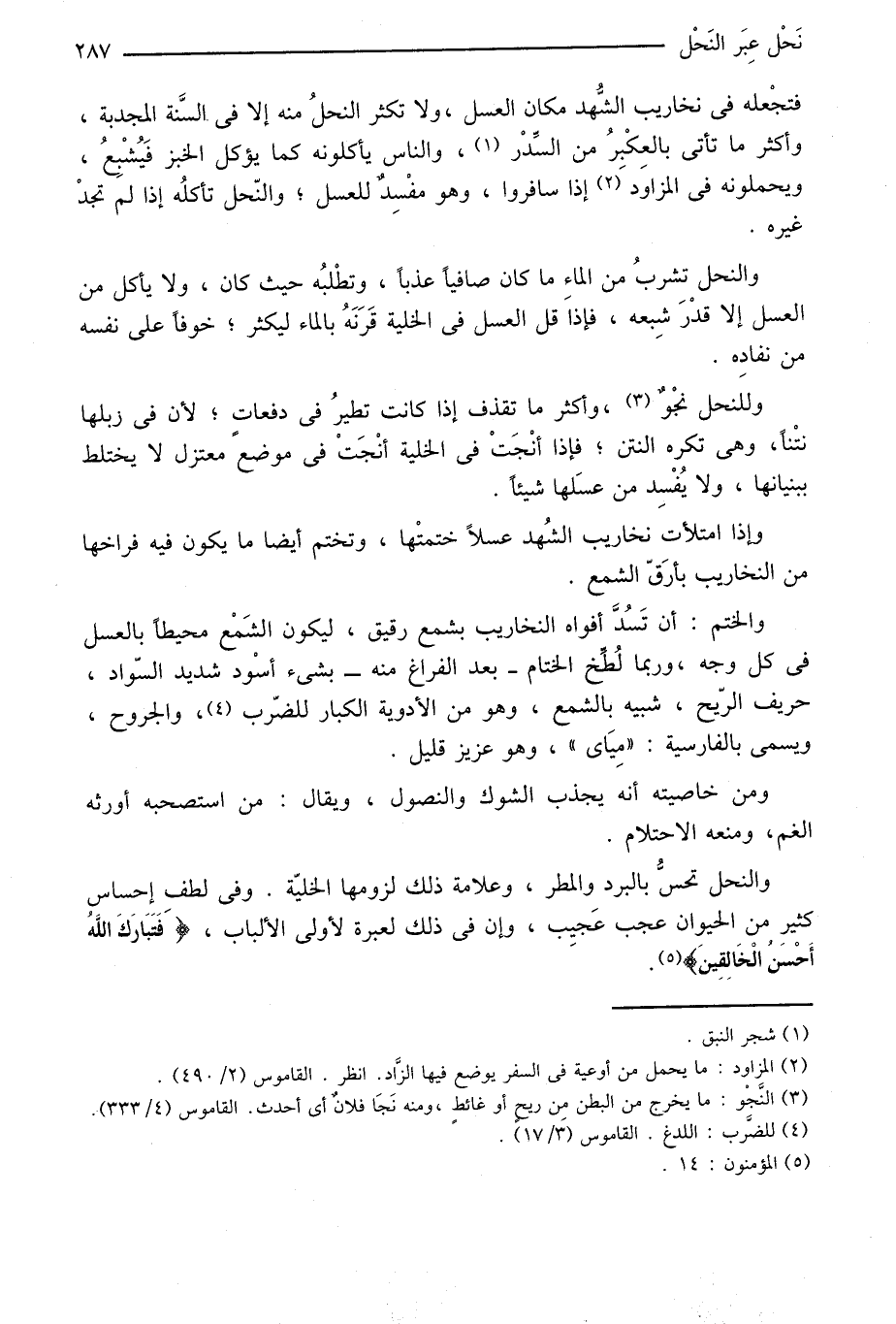 والنحل تحسّ بالبرد والمطر، وعلامة ذلك لزومها الخليّة. وفي لطف إحساس كثير من الحيوان عجب عجيب، وإن في ذلك لعبرة لأولى الألباب، فَتَبارَكَ اللَّهُ أَحْسَنُ الْخالِقِينَ